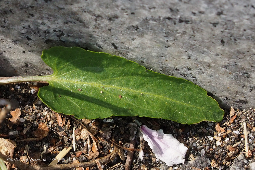 꽃받침부속체에 약하게 거치가 있으며, 옆꽃잎에 털이 거의 없고 자색 줄무늬도 없거나 약하다.