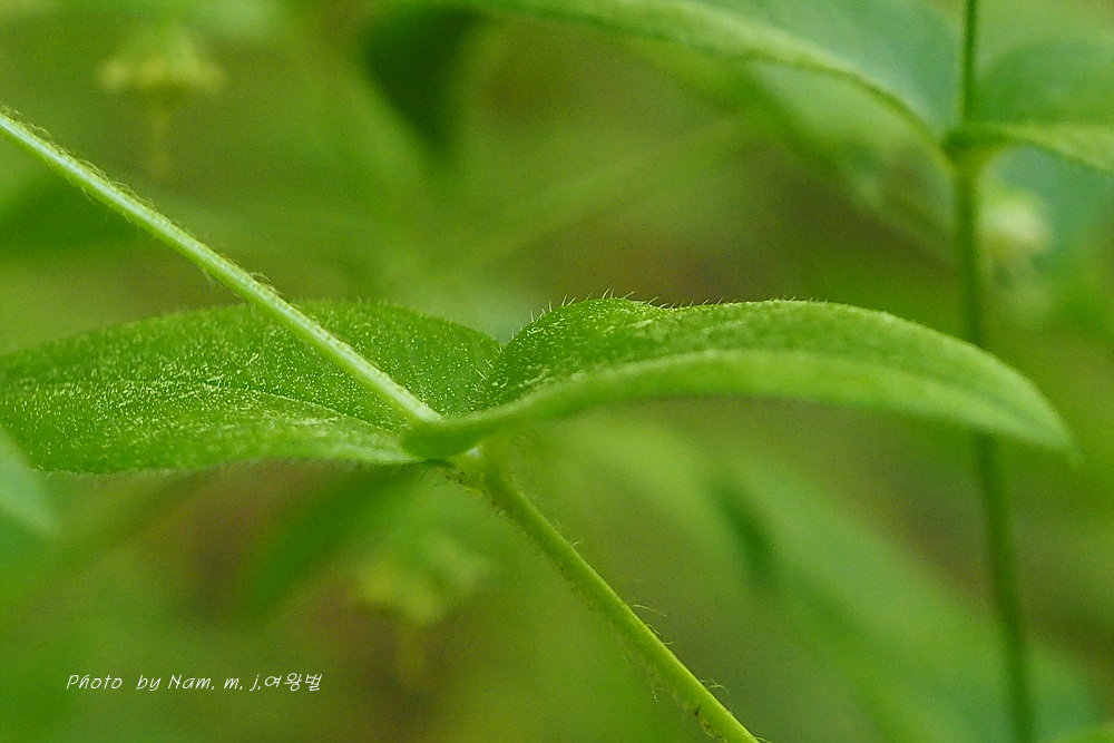 줄기 아래에 달리는 잎은 선형 또는 피침형, 잎 양면에 털이 있고, 가장자리와 뒷면 잎맥 위에 긴 털이 있다.