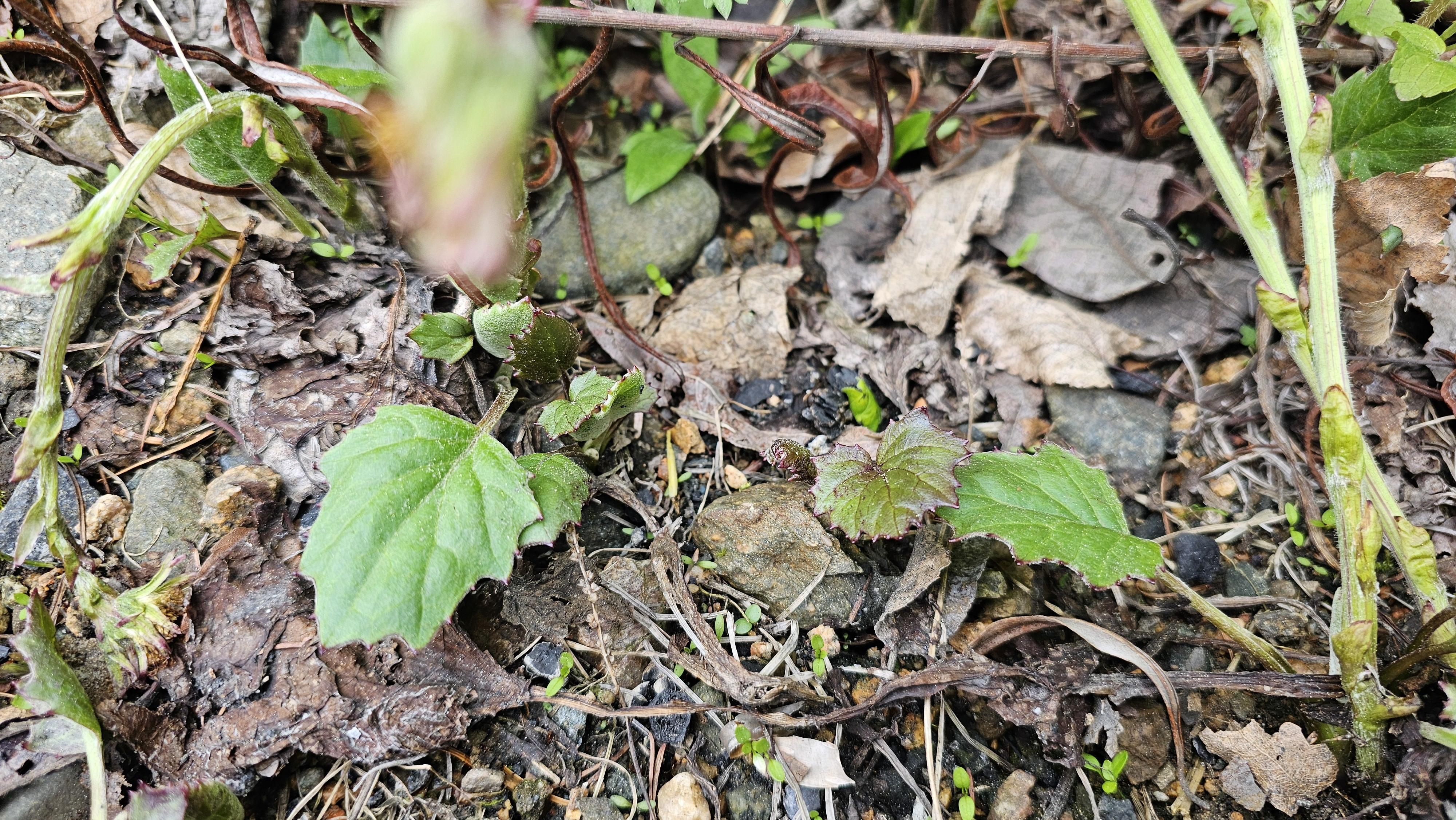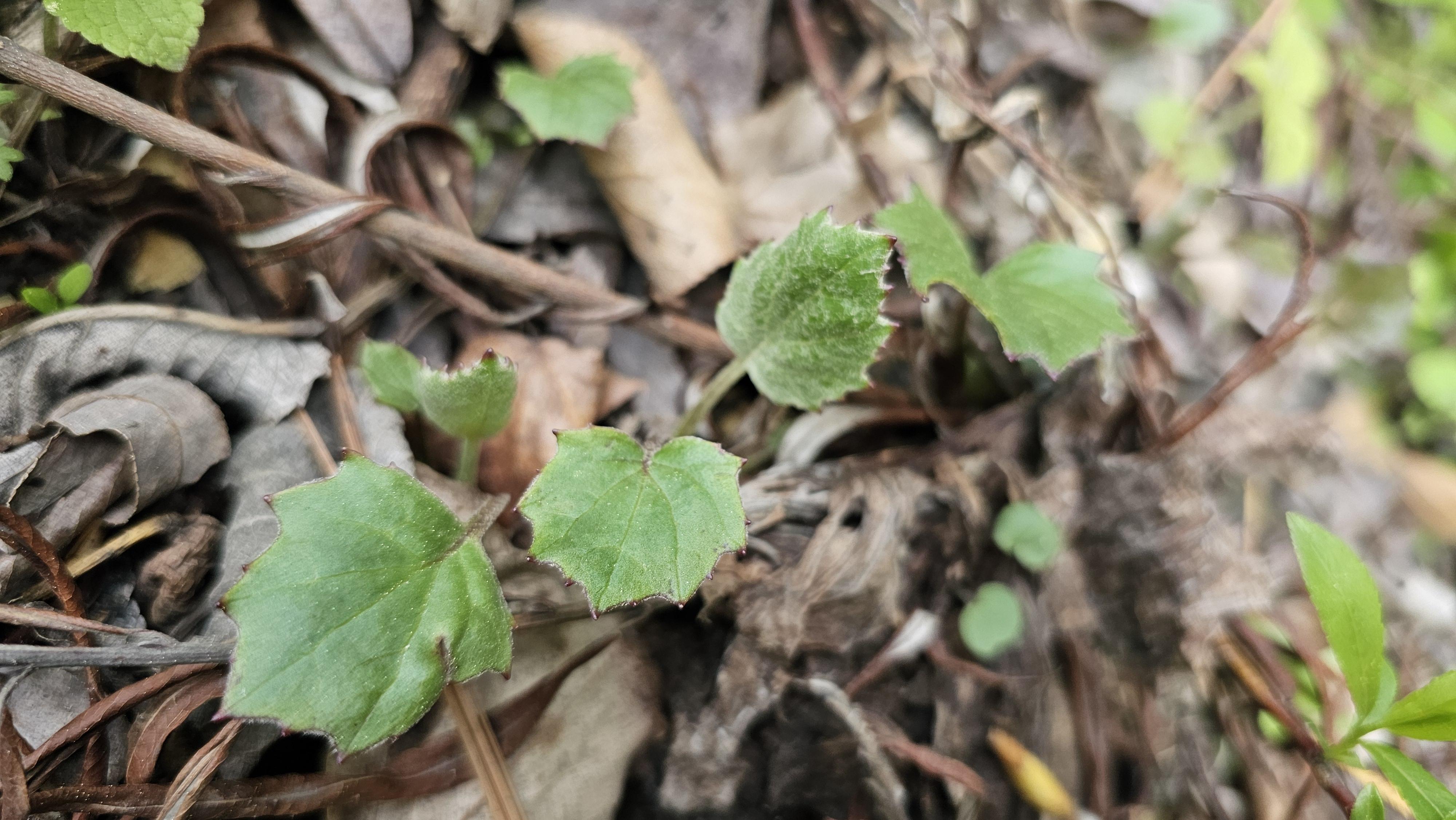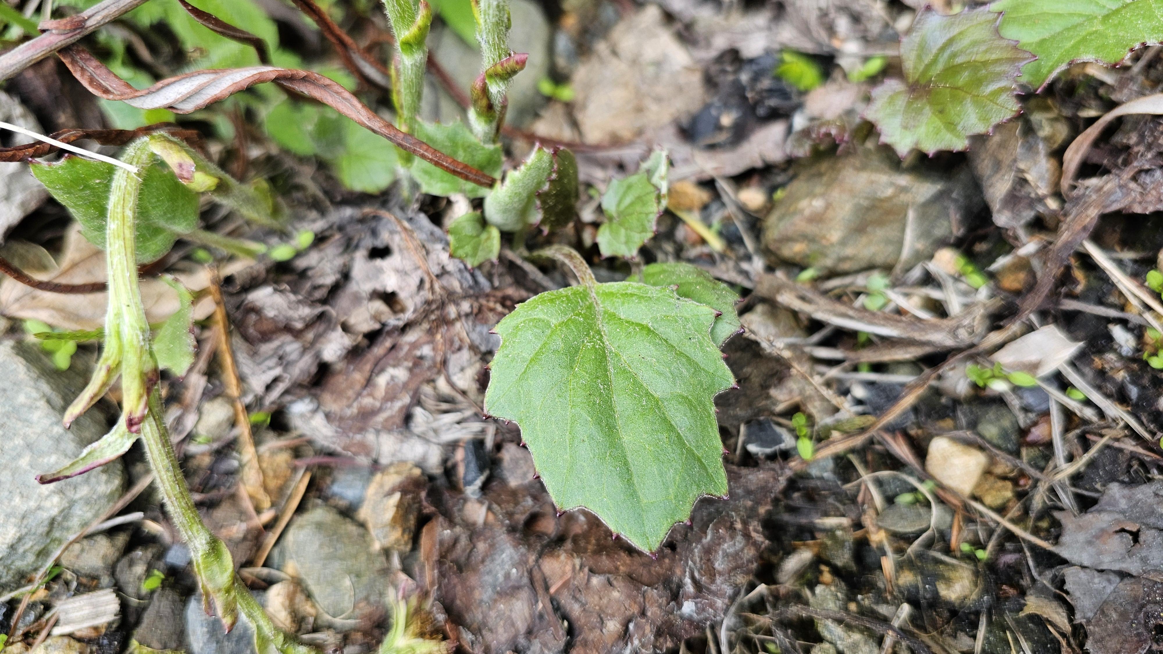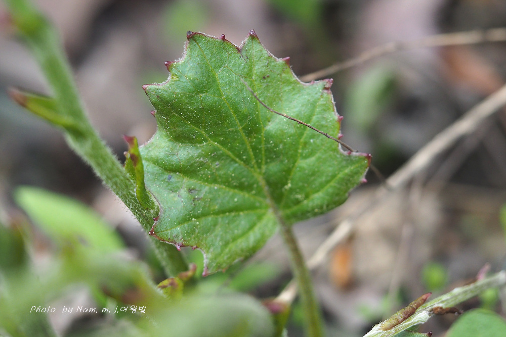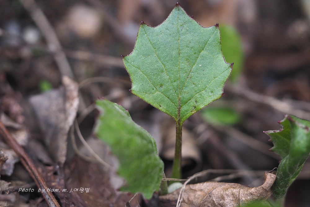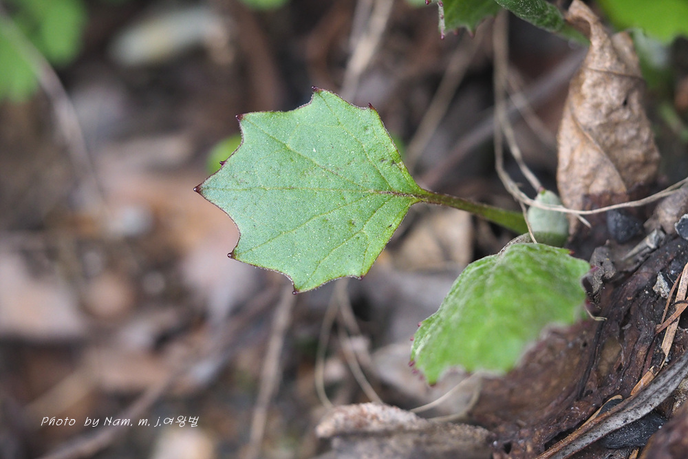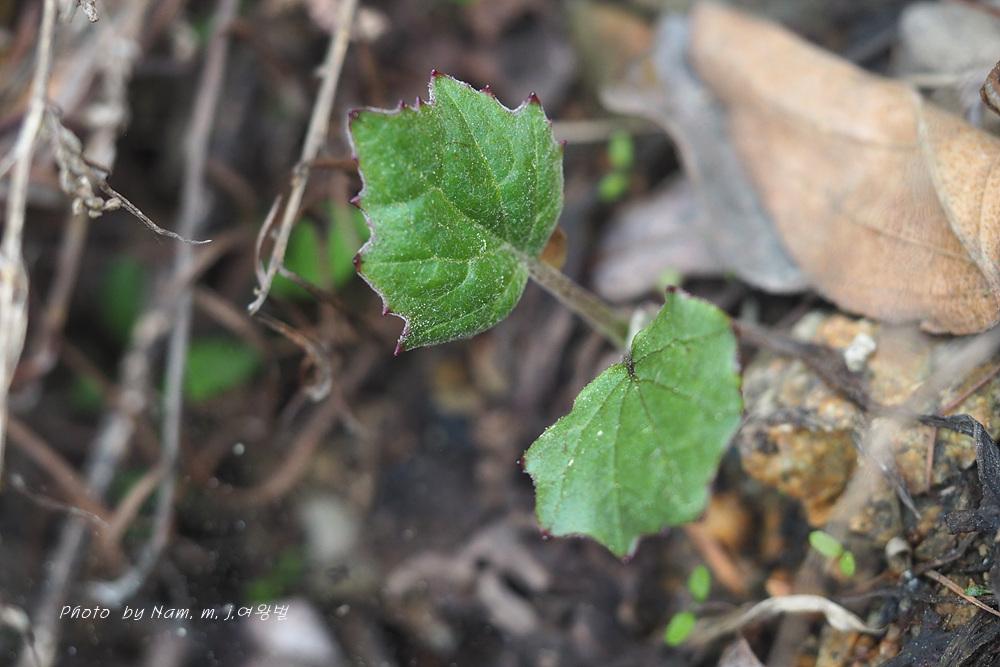 뿌리 잎은 개화기 후에 나타나며 5-15cm 정도의긴 잎자루가 있다. 잎 가장자리 물결 모양이며 불균등하게 톱니가 있다.