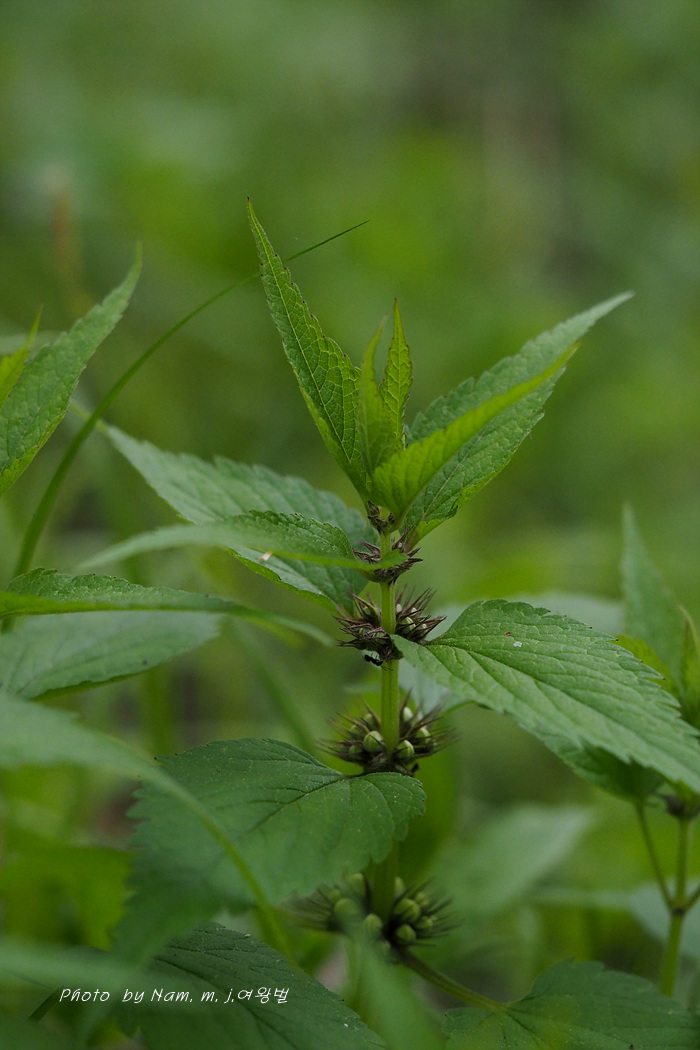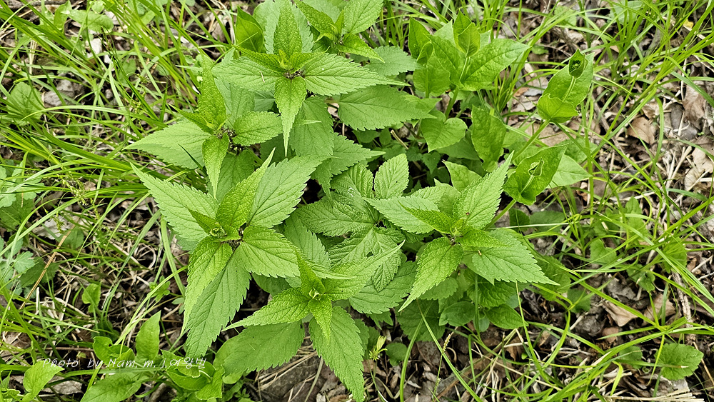 잎은 마주나기하고 장란형 또는 난상 피침형으로 길이 6cm 나비 2.8cm정도이며 끝은 길게 꼬리처럼 뾰족해지고 밑은 둥글며 가장자리에 다소 안으로 굽은 뾰족한 거치가 있고 표면에 엽병과 더불어 털이 산생한다.