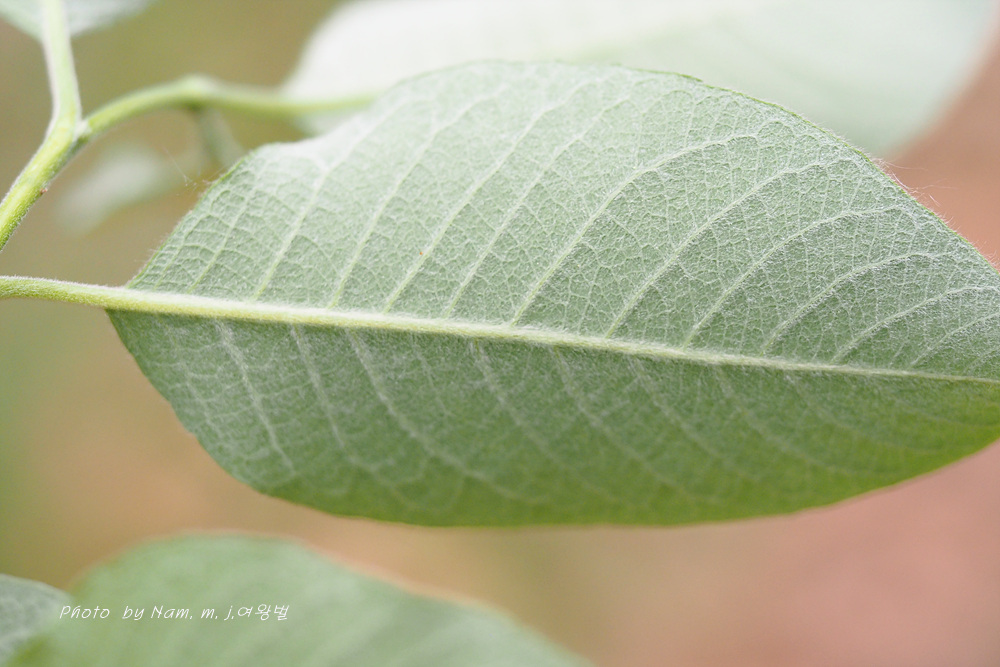 잎 표면이 쭈굴거림이 있으며 잎 뒷면에 백색털이 밀생하며 가장자리에 물결상의 얕은 톱니가 있다.