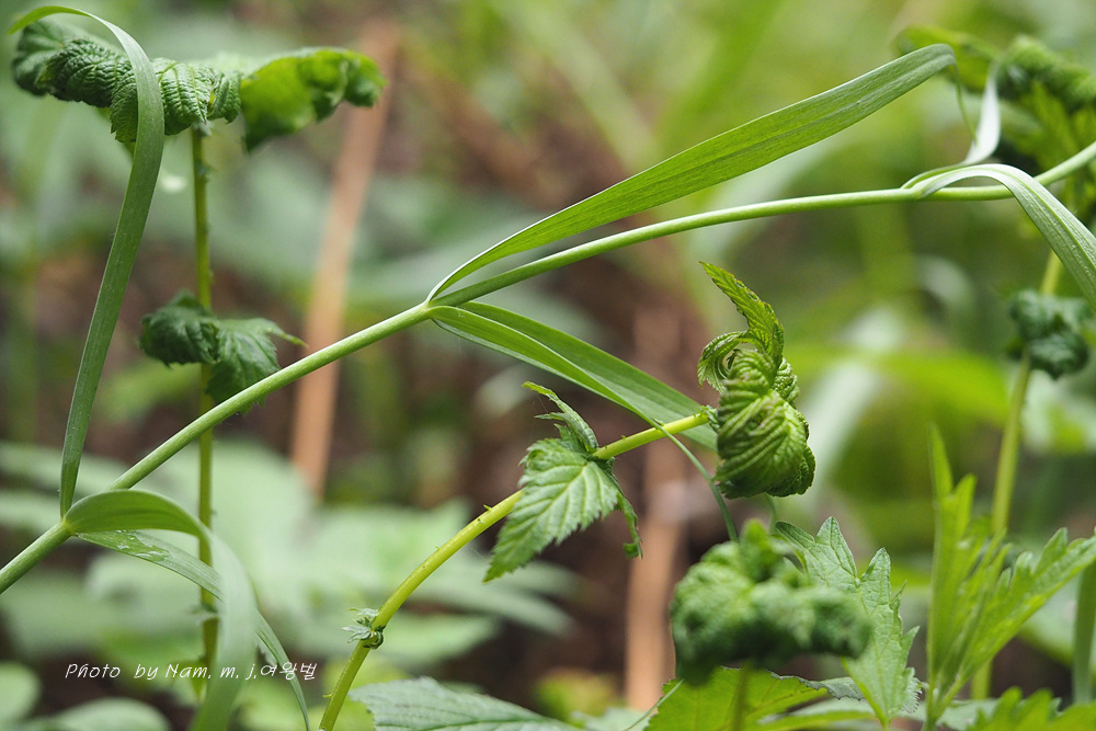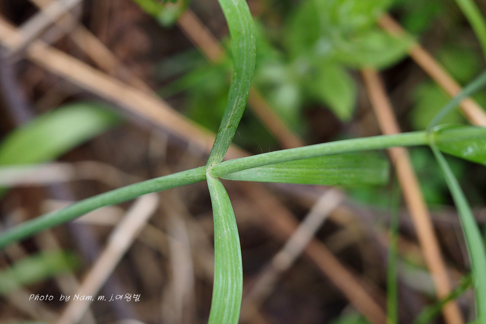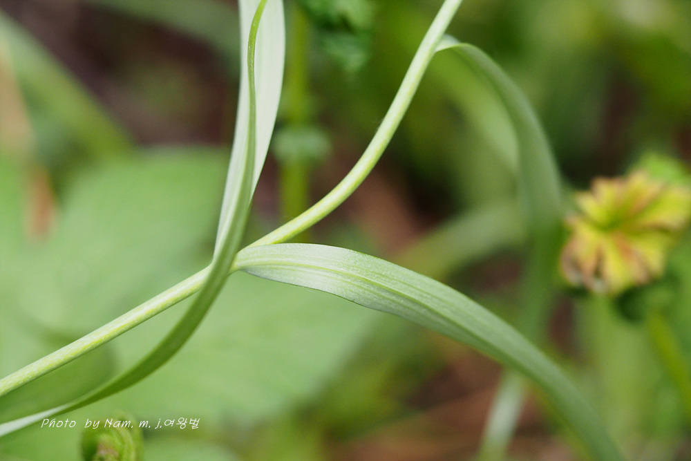 줄기 밑에서 나는 잎은 돌려나고 위에서 나는 잎은 마주난다. 잎은 선형, 끝은 뾰족하고 위에서 나는 잎은 끝이 덩굴손으로 된다.