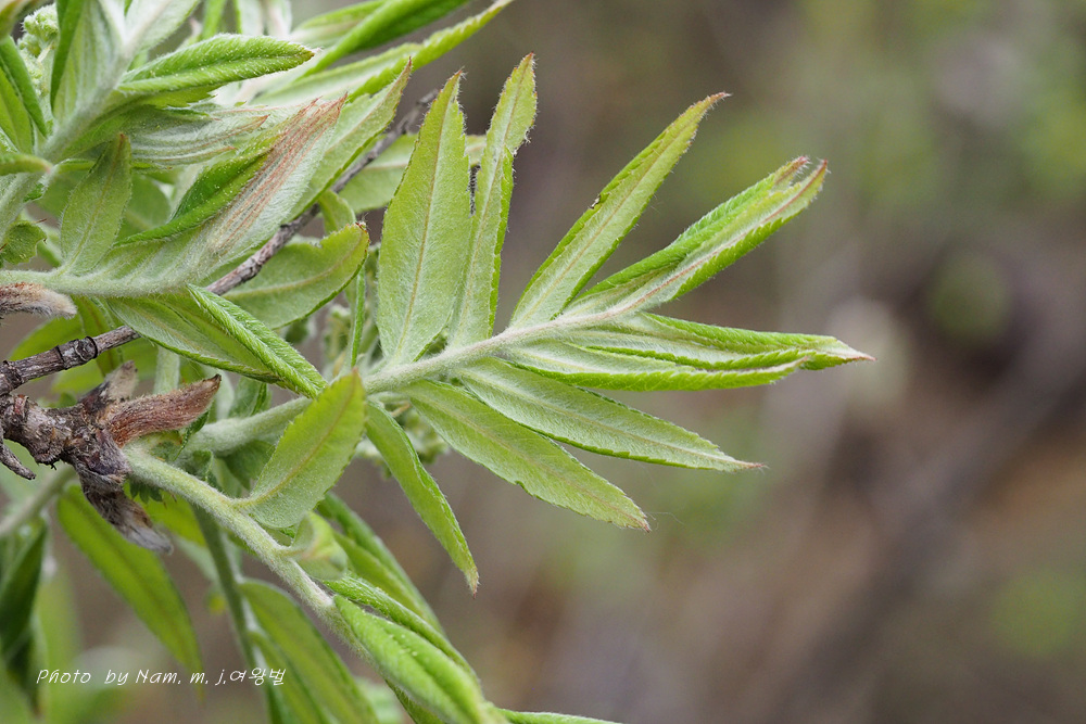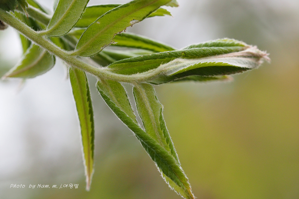 작은 잎은 긴 타원형 또는 피침형으로 뒷면은 털이 밀생하여 흰빛이 돌고 가장자리에 날카로운 톱니가 있다.