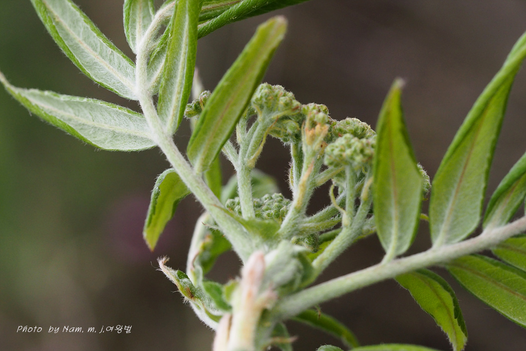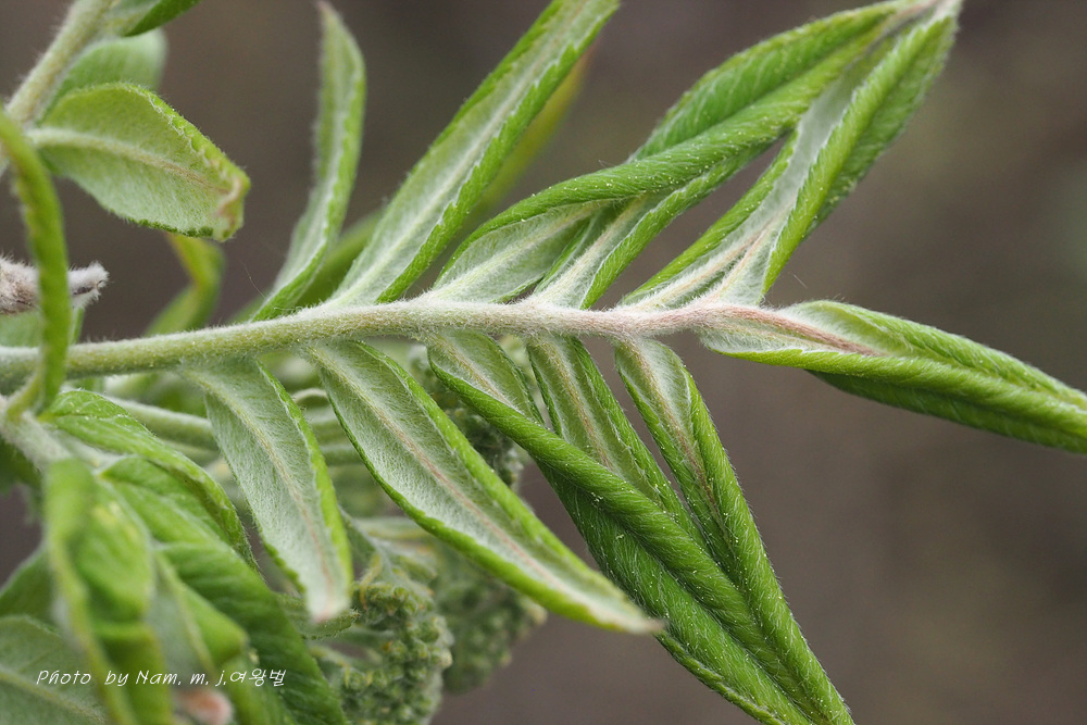 잎 양면과 엽축, 어린 가지에 백색털이 뽀얗게 밀생하고 있다.