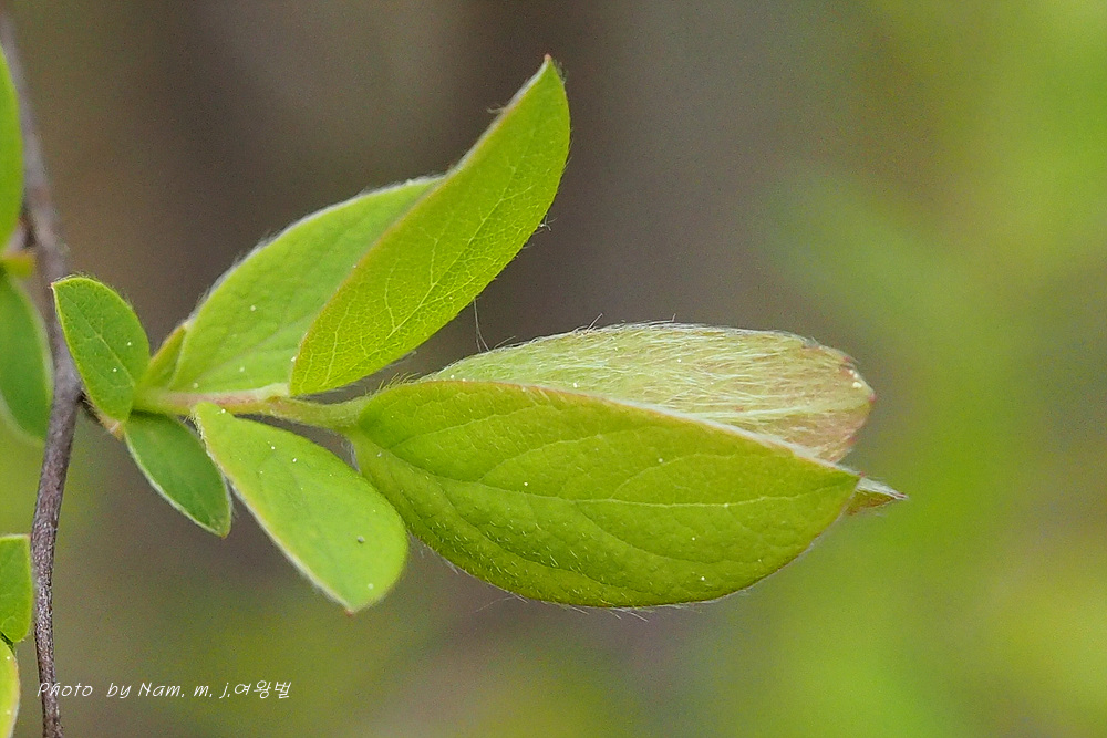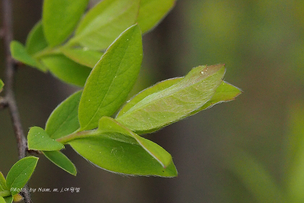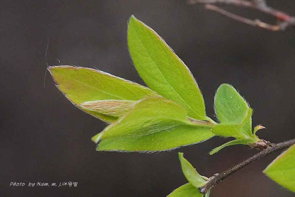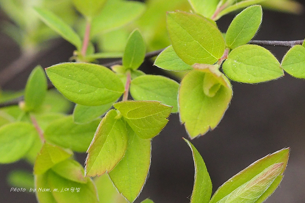 높이 1.5m 정도로 자라는 낙엽 떨기나무이다. 어린 가지에 털이 있다. 잎은 어긋나며 난형 또는 장타원형이고 길이 3.0~3.5cm이다. 잎 상반부에 몇 개의 깊은 톱니가 있거나 전혀 없고, 양면에 털이 밀생한다.