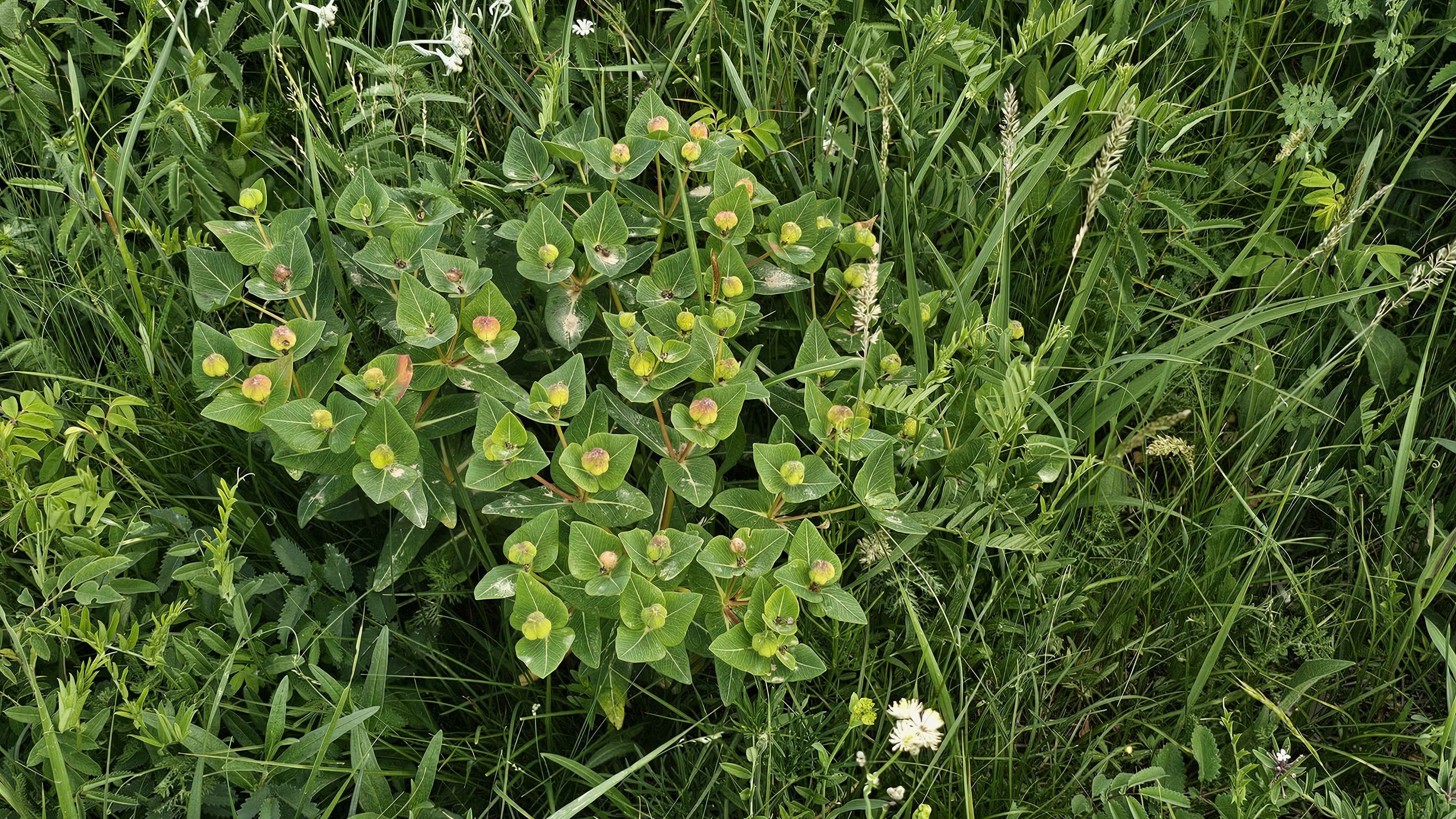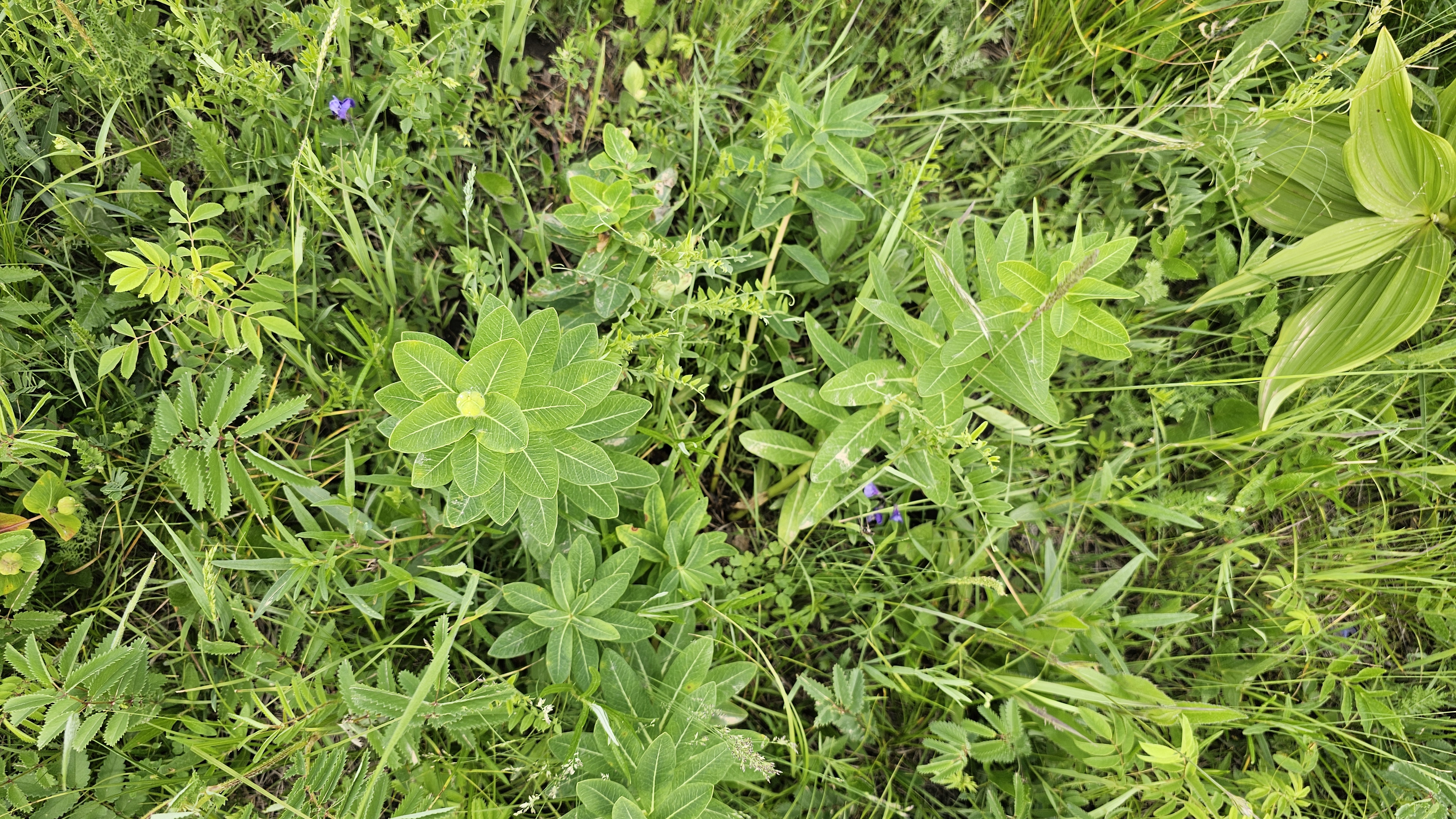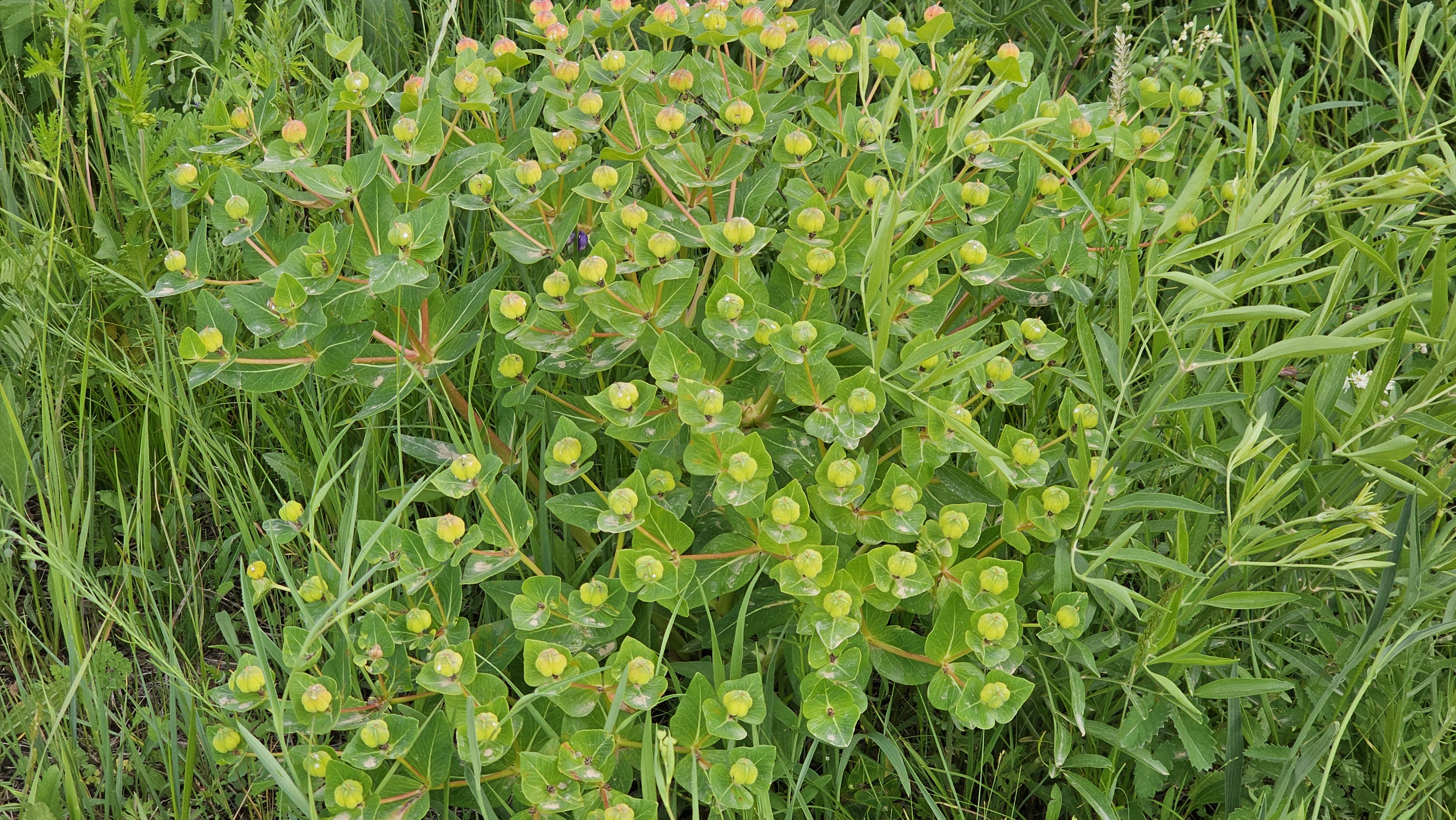 붉은대극과 많이 흡사한 모습이지만 성체의 줄기잎이 4~6장 돌려나기로 붙어 있는 모습이 특징이다