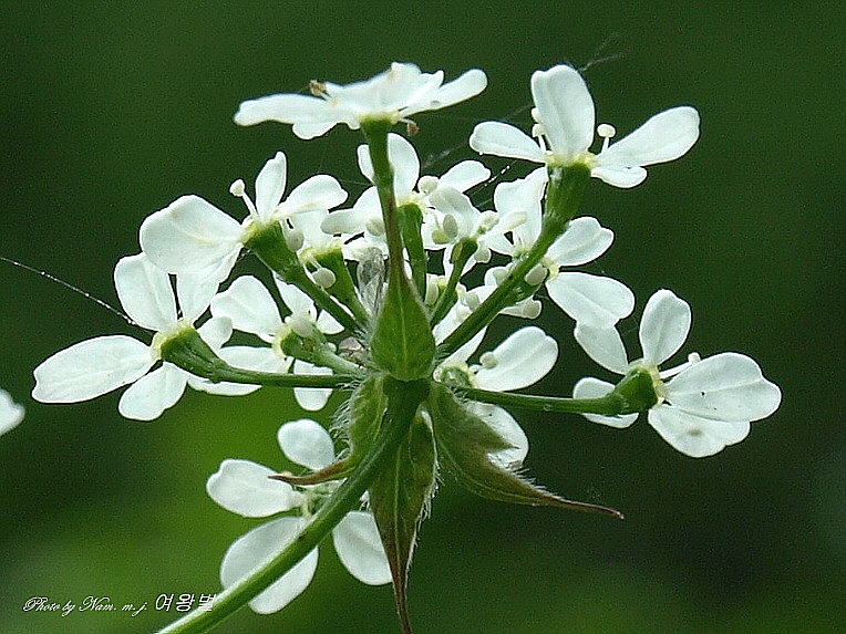 꽃 -산형꽃차례 바깣 쪽의 꽃잎 두장이 좀 더 큰 점은 비슷하나. 형태는 조금 차이가 있다.