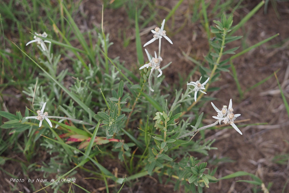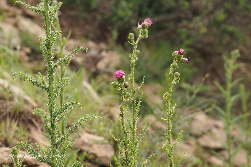 사면 한 쪽에 엉겅퀴 종류가 무리지어 있다.