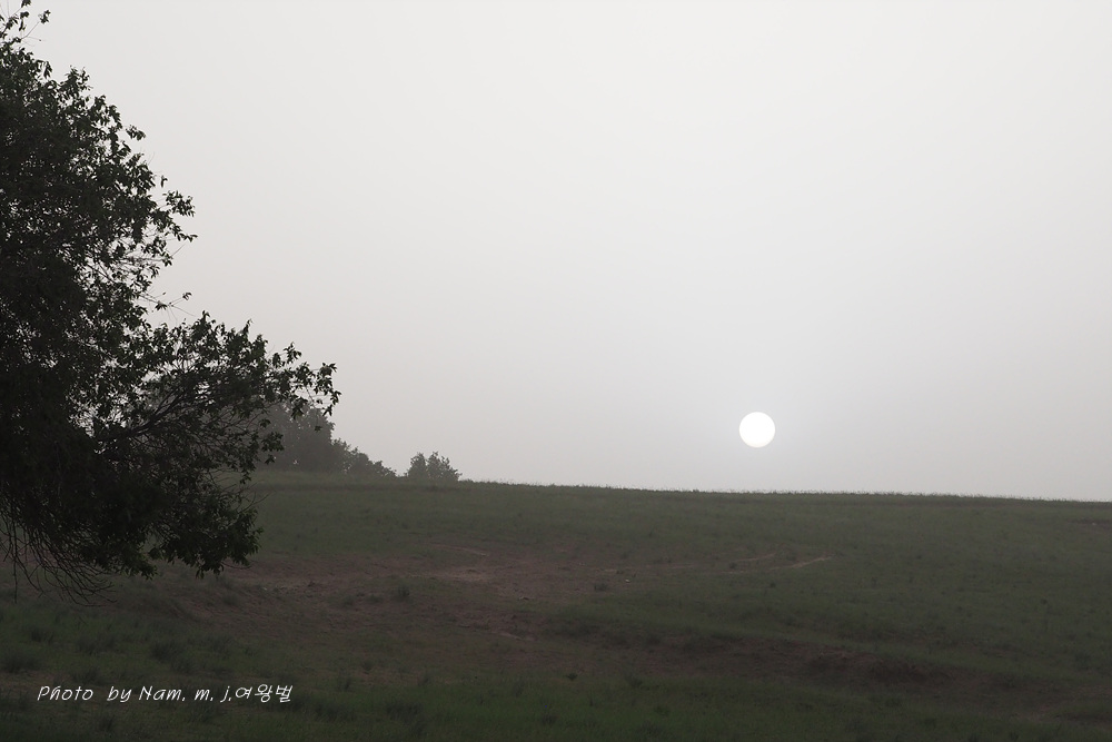 저만치 언덕 위로 해가 떠올랐다. 황사로 희뿌연 하늘에 진주 구슬하나 던져 놓은 듯.