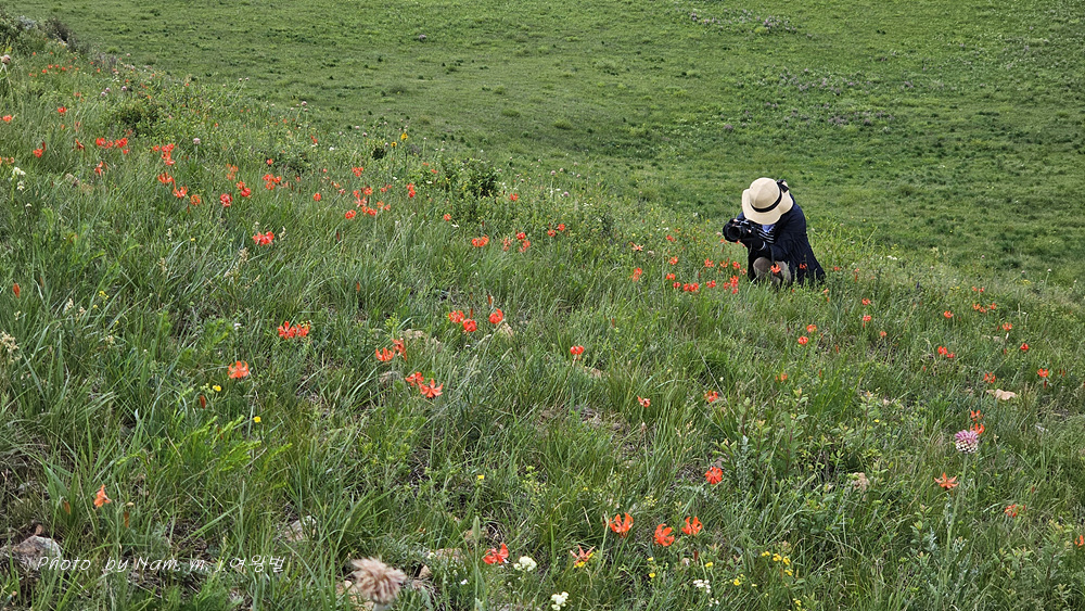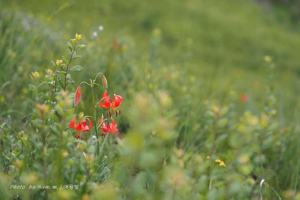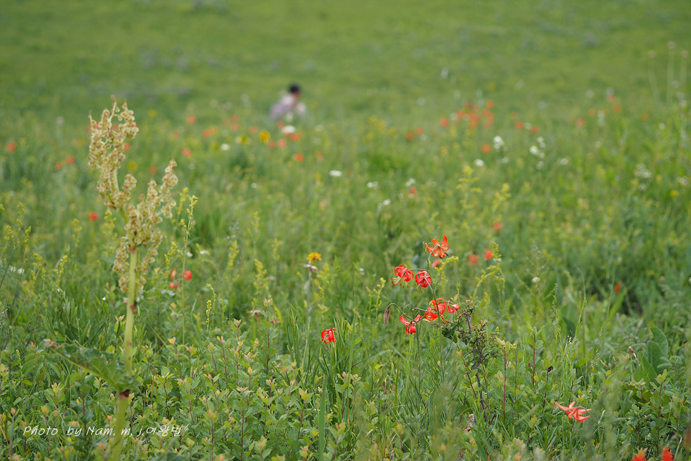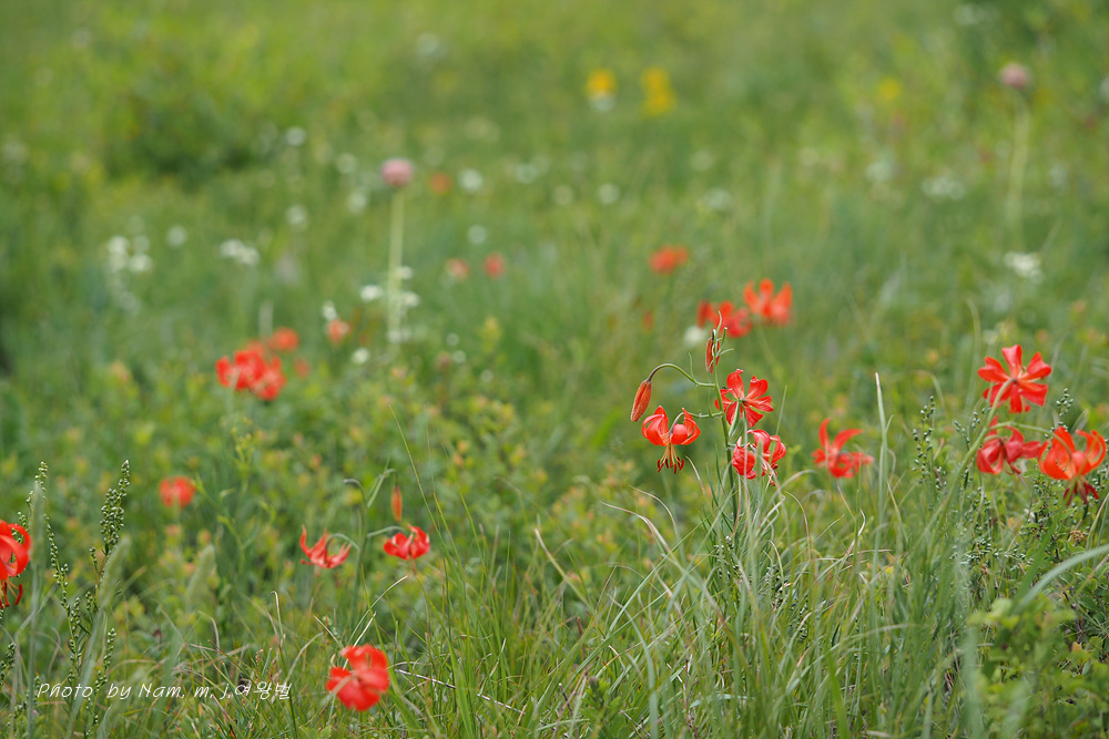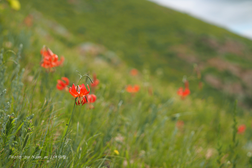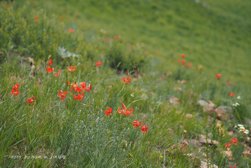 더딘 걸음으로 느적느적 올라간 바위산 정상 능선부 사면은 온통 붉은 큰솔나리로 산사태가 일어나고 있었다.