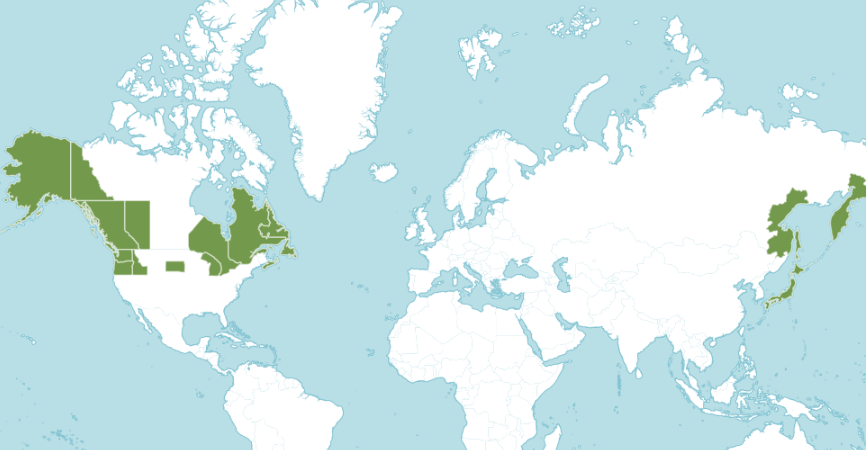 원산지는 러시아 극동에서 일본까지, 아북극 아메리카에서 동부 아메리카 까지다.