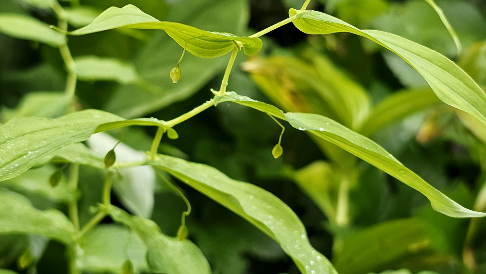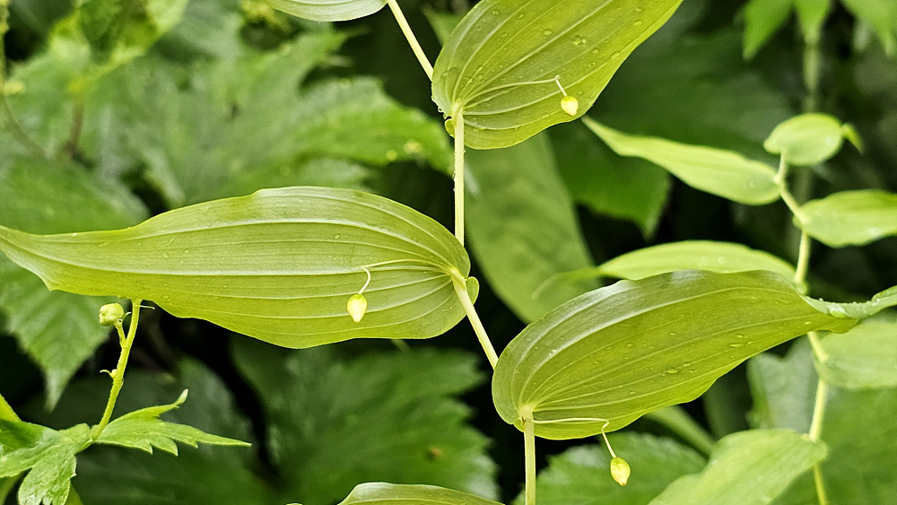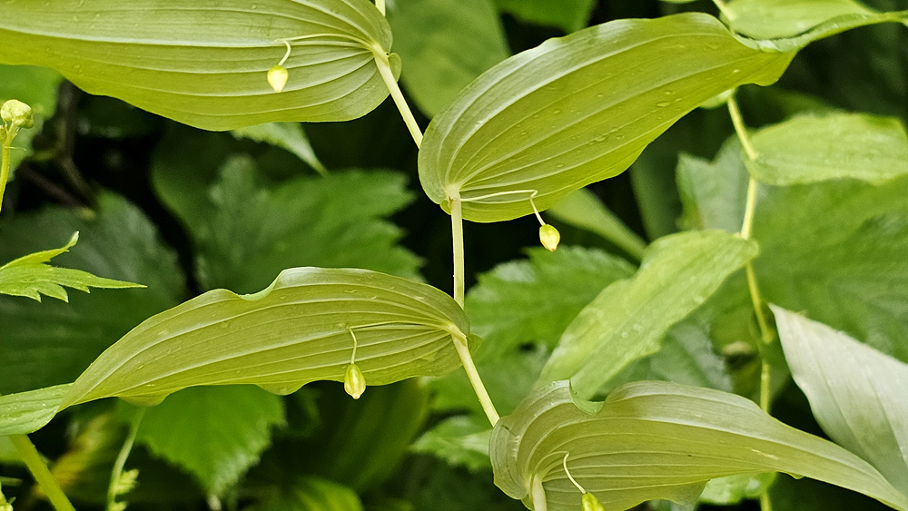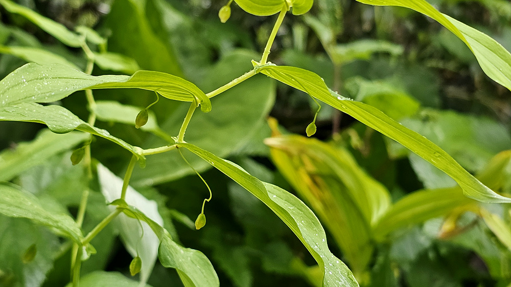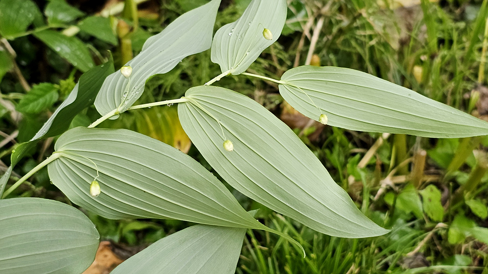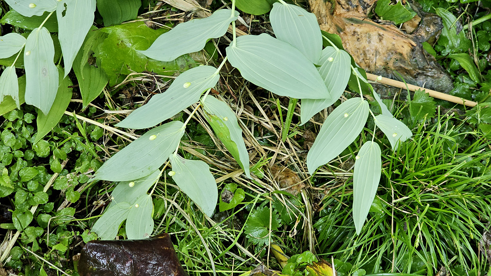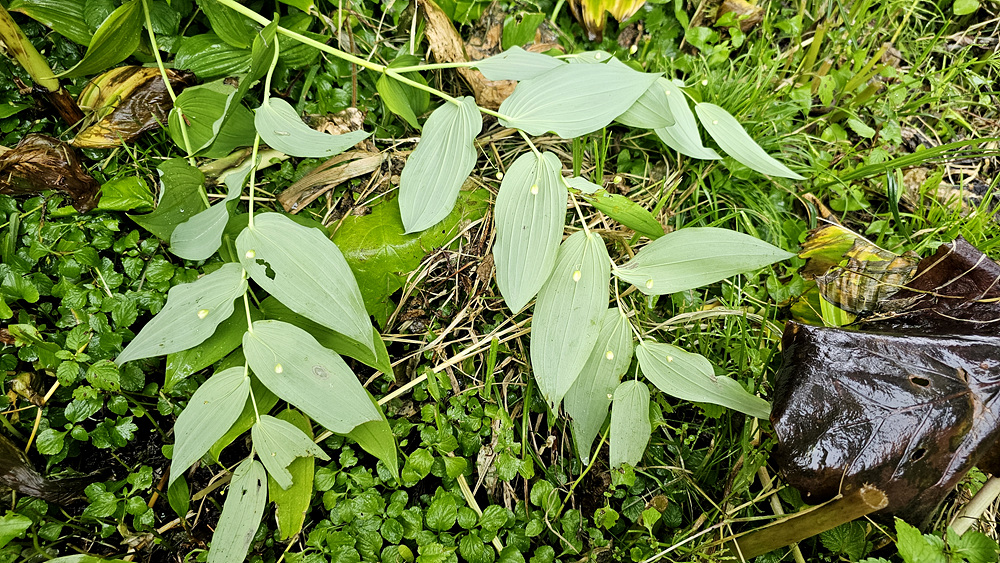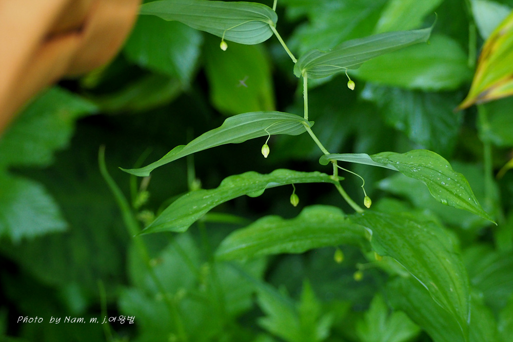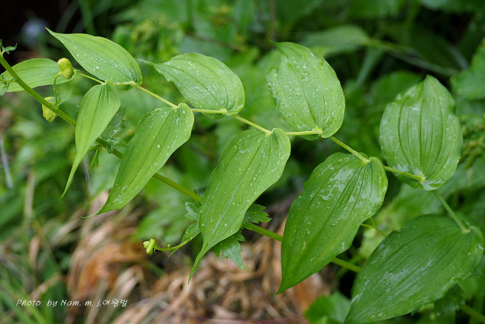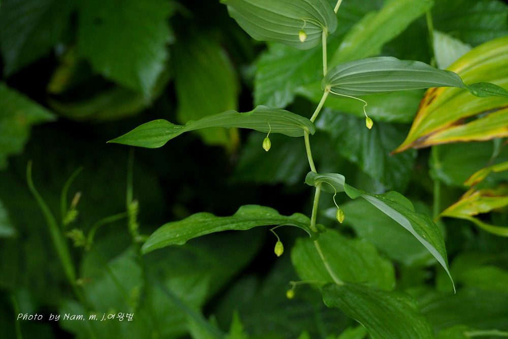 | 원줄기는 높이 50-100cm이다. 화경은 가늘고 바로 위에 달린 잎 밑부분까지 원줄기에 붙으며 떨어진 부분은 길이 2-4cm로서 중앙부에 관절이 있어 꽃이 처지고 각각 1개씩 달린다. 꽃은 녹백색으로 잎겨드랑이에 1송이씩 달리며 넓은 종같고 화피열편은 피침형이며 길이 8-10mm로서 윗부분이 젖혀진다. 열매는 장과로 둥글며 지름 1㎝로 붉은 색으로 익는다. |