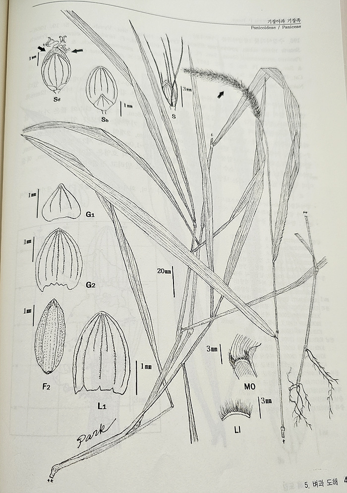 | 가을강아지풀 | 굽어서 끝이 늘어진다 | 8-10월 | 2.8 - 3.0mm | 2포영은 2소화보다 짧다. |
