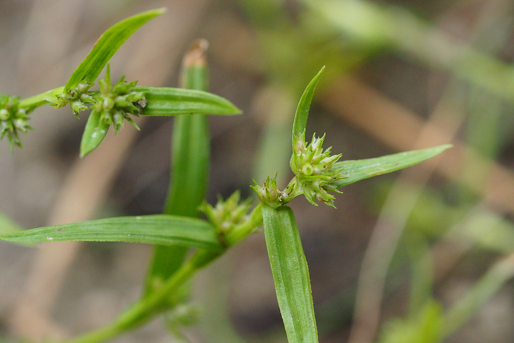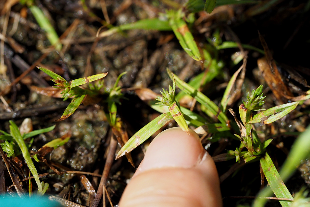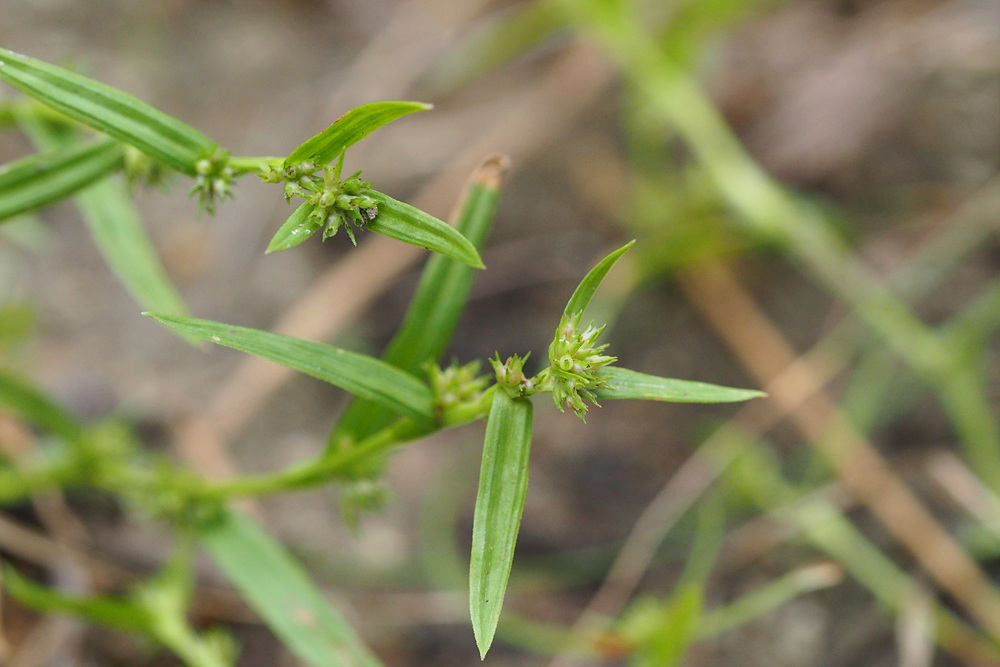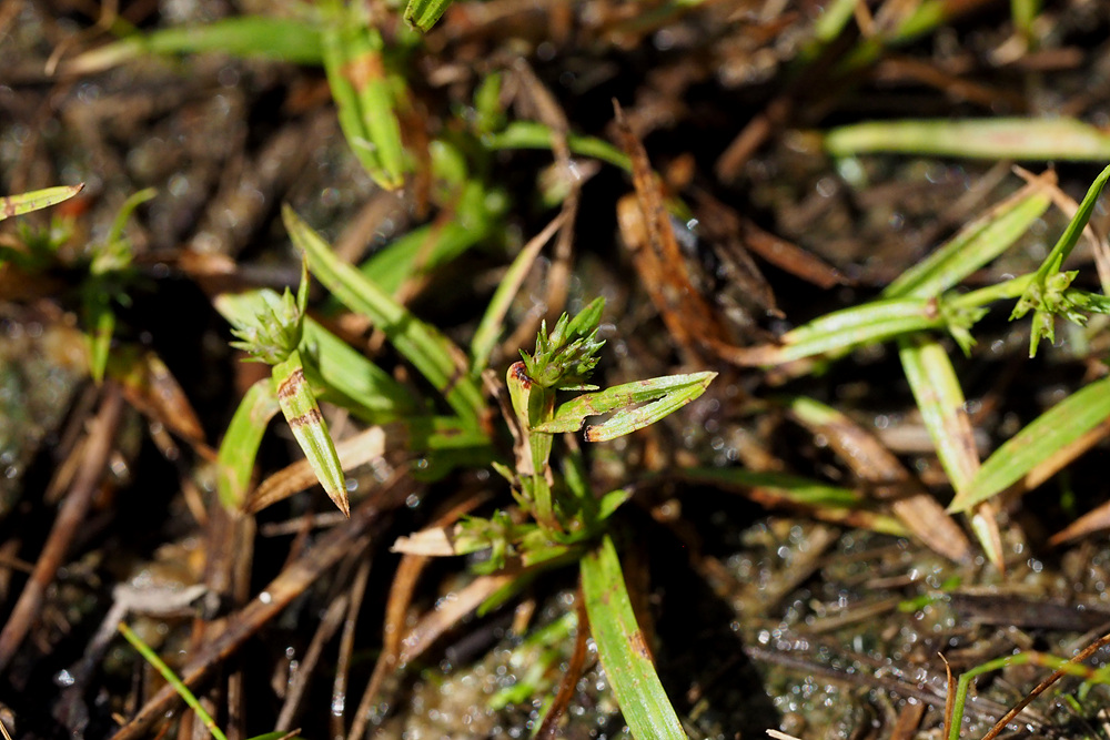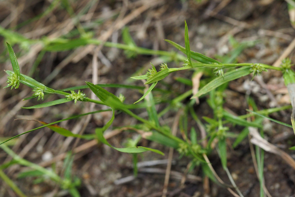 | 일년생. 근경이 없이 모여나고, 뿌리는 실 모양이며, 적자색이다. 줄기 높이 3-15cm로 식물체가 작다. 무모이고, 직립하거나 비스듬히 자라며, 단면은 삼각형이다. 잎 엽초에 좁은 날개가 있고, 날개는 위쪽일수록 더 넓으며, 엽설은 없다. 엽신은 선형이고, 길이는 1-4 cm, 너비는 1.5-3mm이며, 끝은 예두 혹은 서서히 좁아진다. 포엽과 소포엽 잎모양 또는 인편모양이고, 길이 3-10mm이다. 화서 두상 또는 취산화서로 짧은 자루가 있고, 몇 개 또는 많은 소수가 엽액에 모여 달린다. 소수 자성화의 기부에 작은 웅성화가 붙는다. 웅인편 좁은 난형이고, 둔두이다. 자인편 장타원형이고, 길이 1.5-2mm, 끝은 예두이거나 3열되며, 중앙열편은 더 크고 길다. 수과 2개의 인편에 둘러싸여 있고, 공모양이며, 길이 0.8-1mm, 3개의 세로줄과 사각형의 그물무늬가 있다. 주두 3갈래로 갈라진다. |