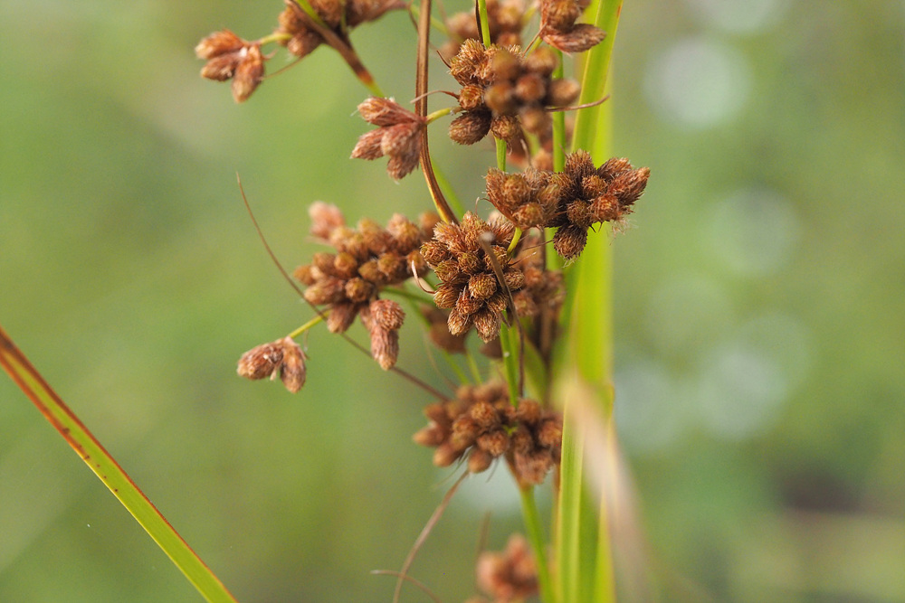 방울고랭이 ; 소수 3~7개 열매가 구형에 가까운 타원형 이삭이 아래로 늘어진다. 화서 가지가 까끌거린다. 개화기 8~9월