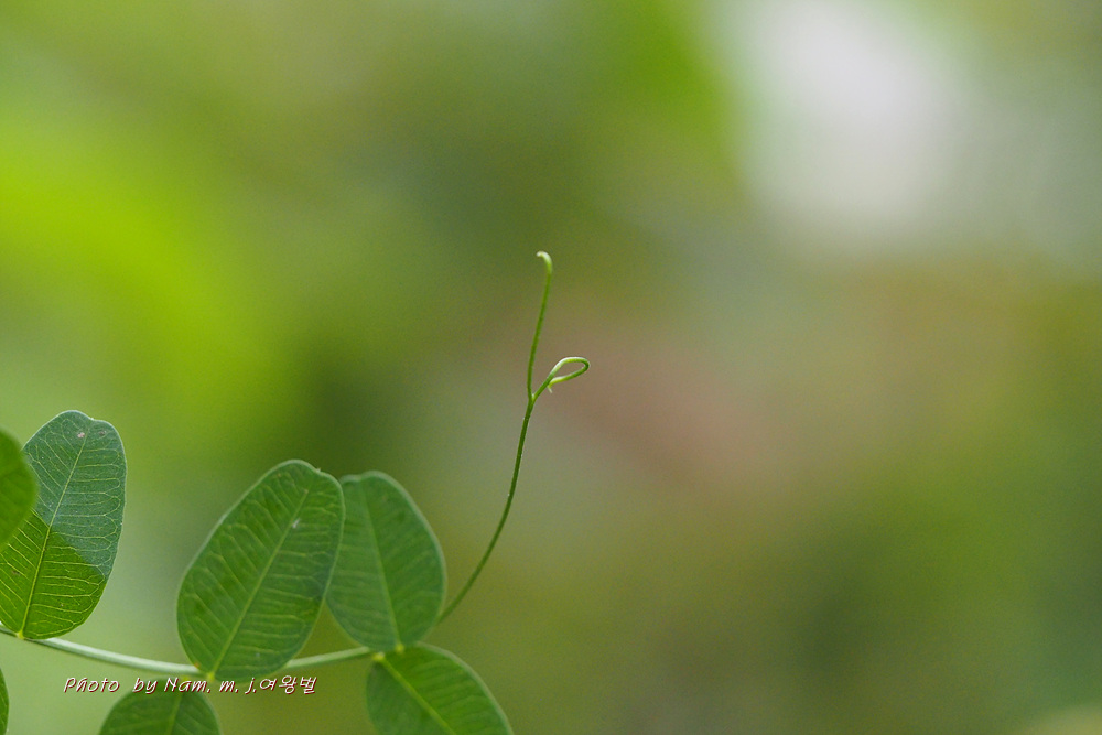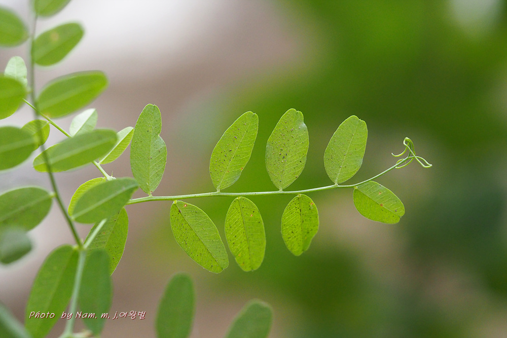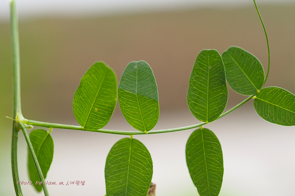 5~8쌍의 작은잎으로 구성된 우수 깃꼴겹잎이며, 끝은 2~3개로 갈라진 덩굴손이 된다.