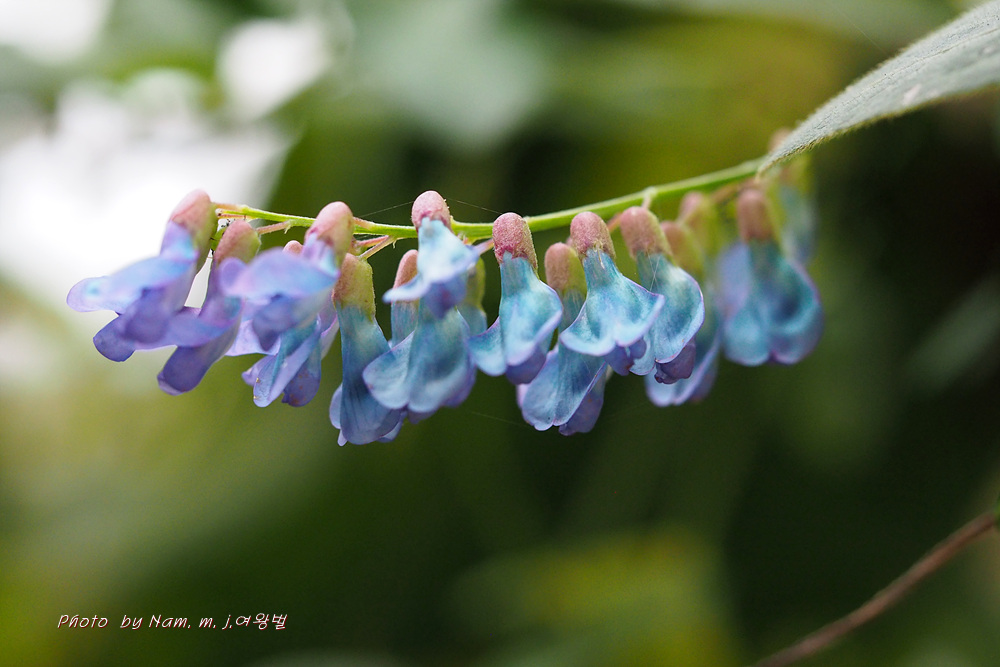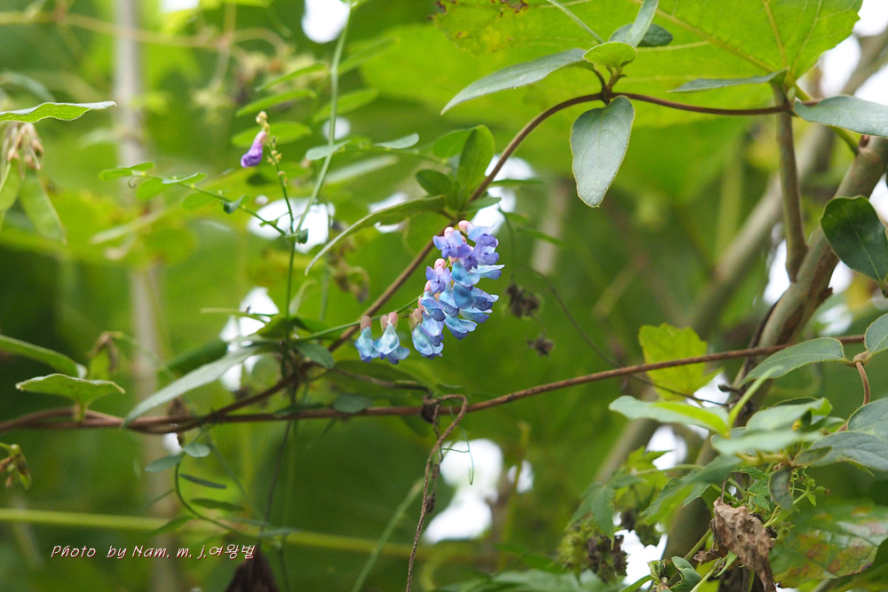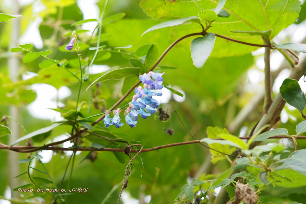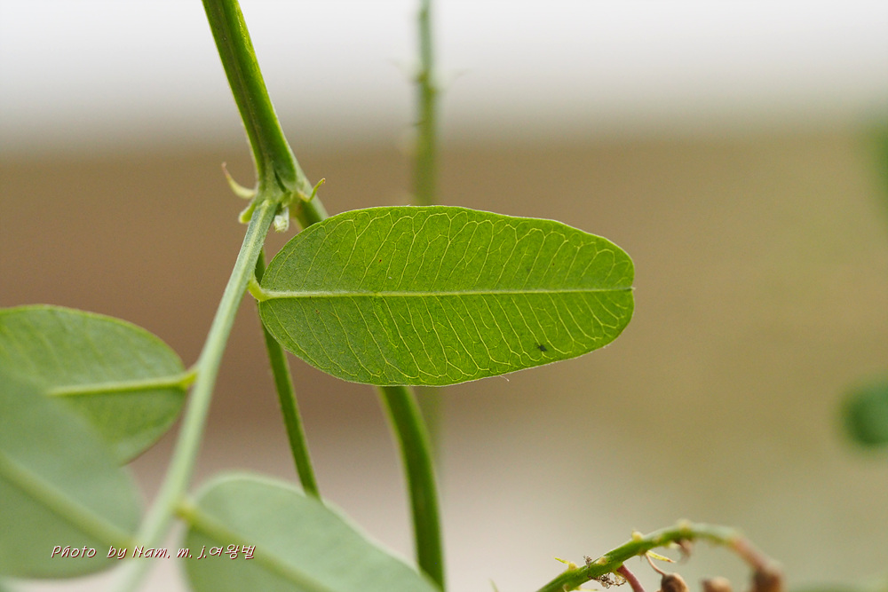 타원형 또는 긴 타원형의 엽형과 주맥과 이루는 측맥의 둔각, 청자색의 화색을 종합적으로 분석하여 벌완두로 확인하였다.