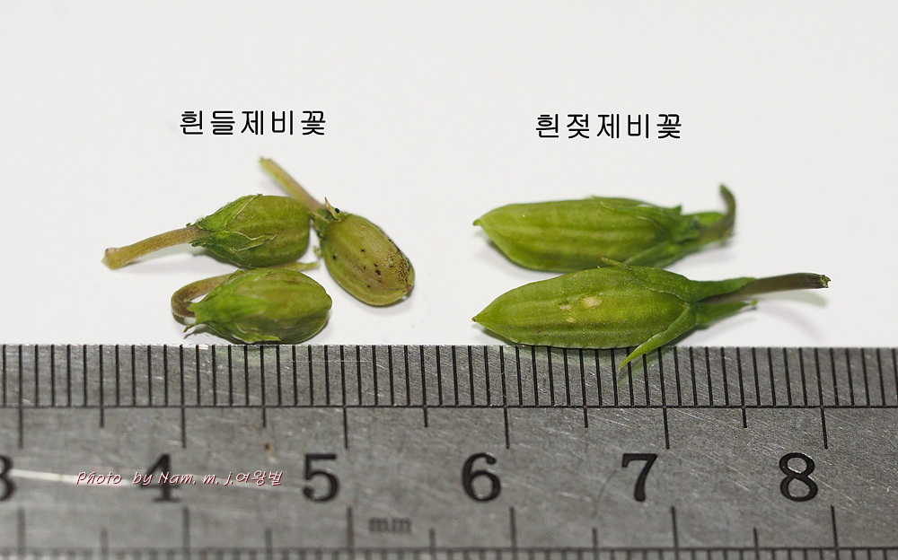 흰들제비꽃의 열매가 더 작고 끝이 뭉툭하다.