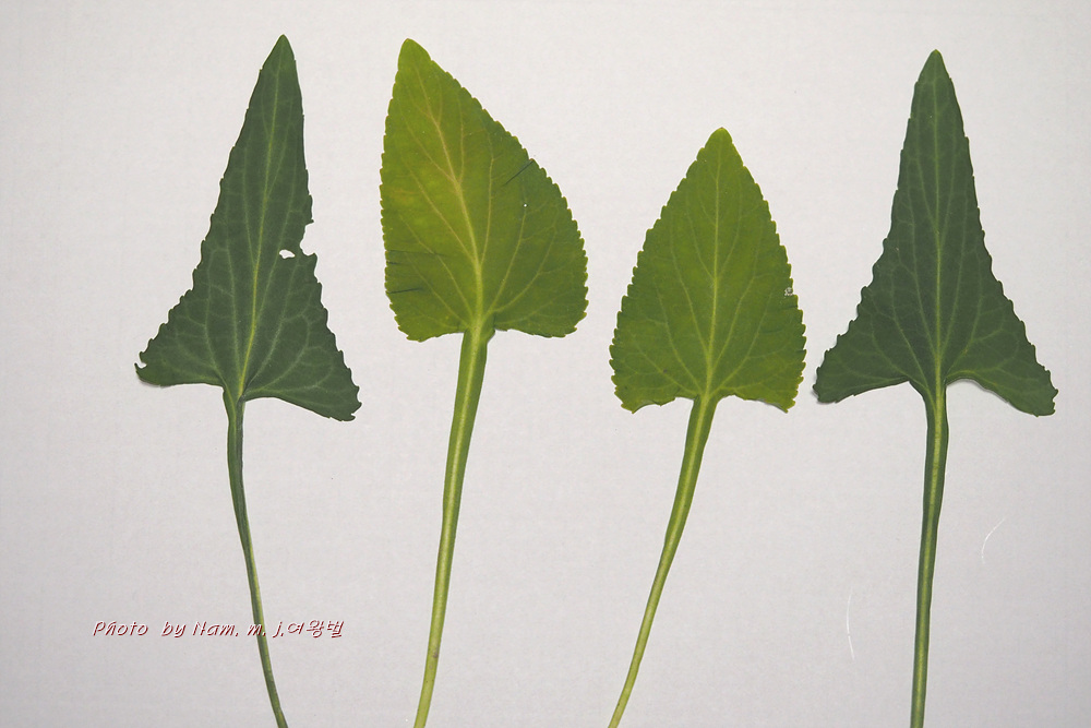 흰들제비꽃: 옆저가 화살촉 처럼 뾰족하고 잎자루로 얕은 날개가 흘러내린다![]() |