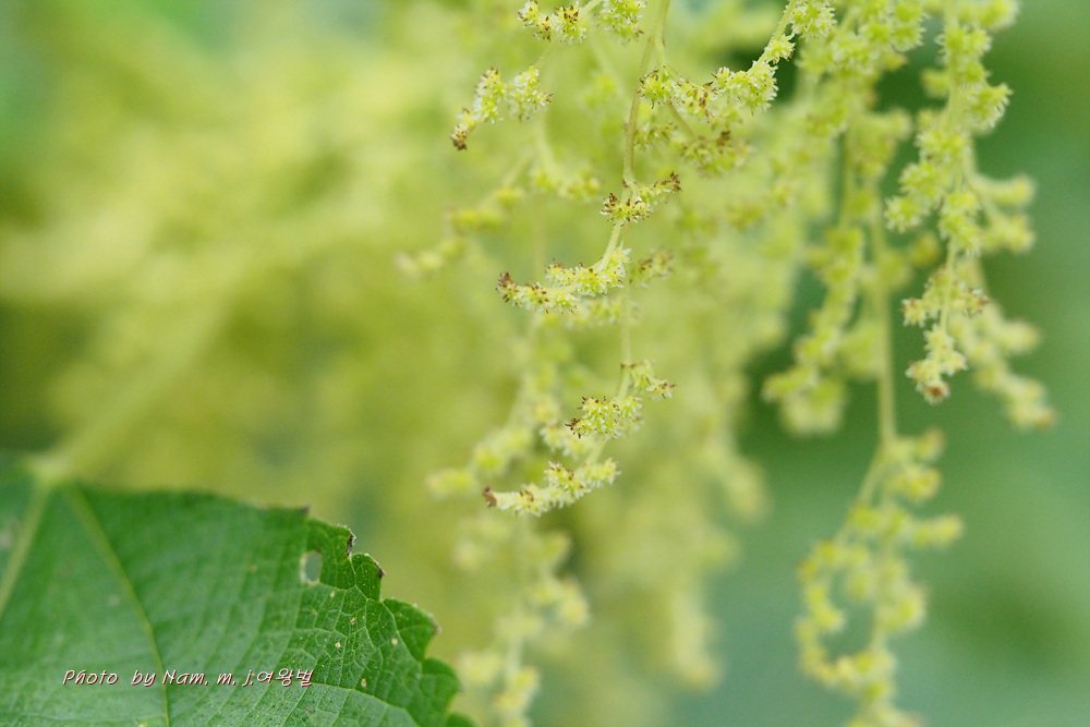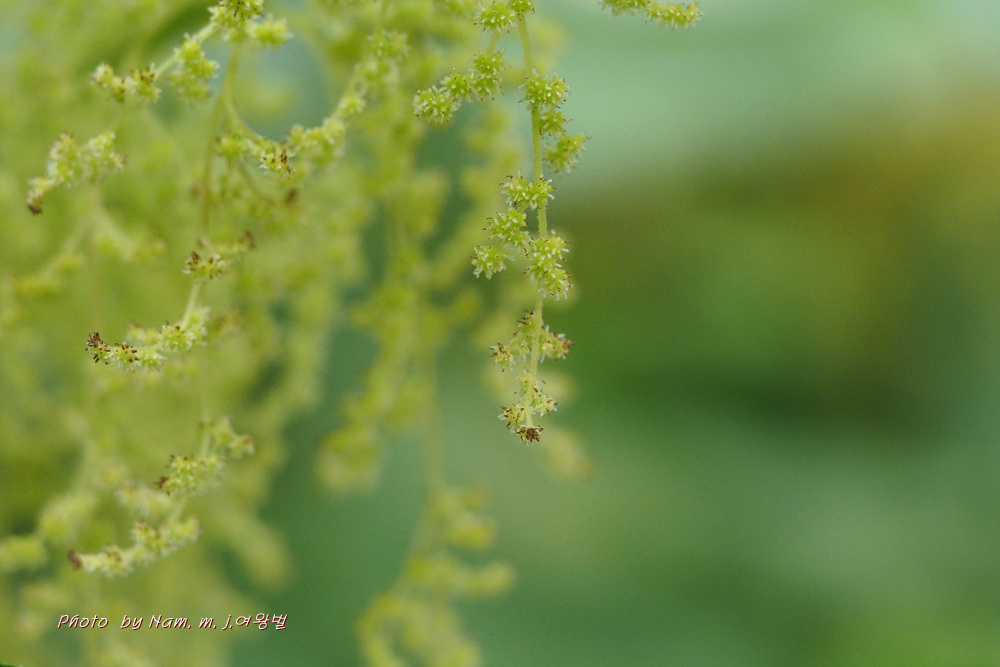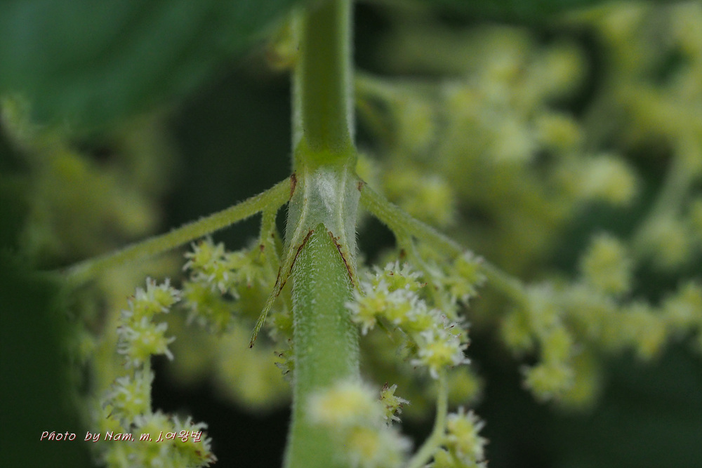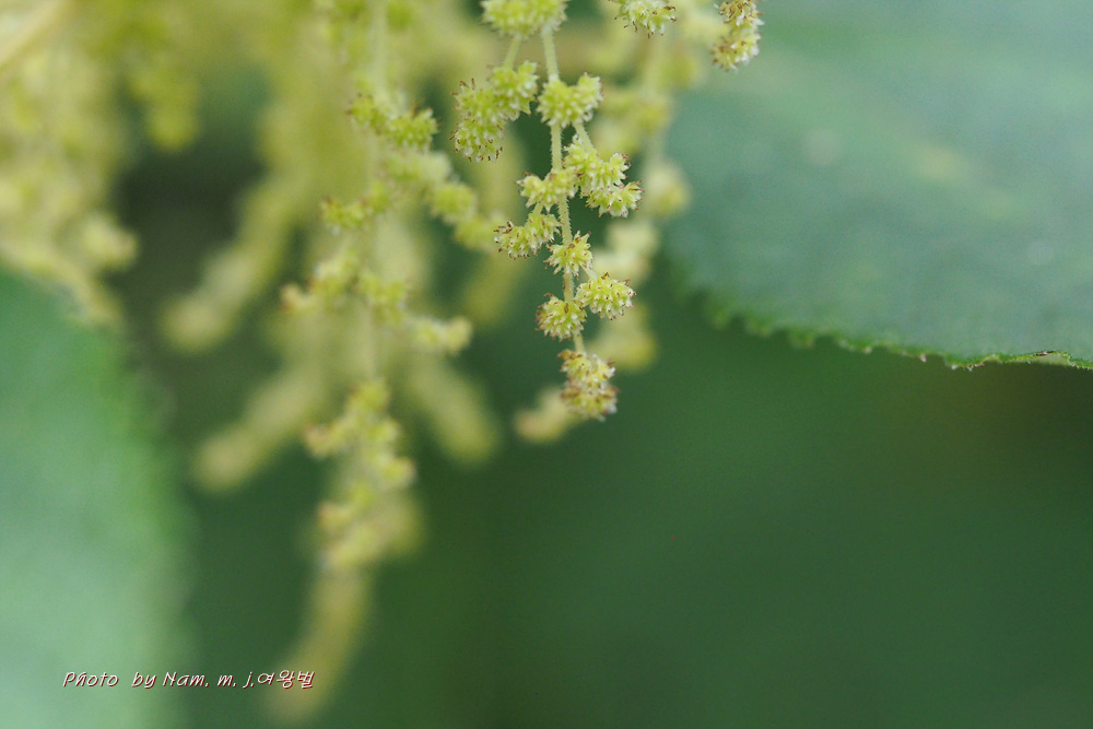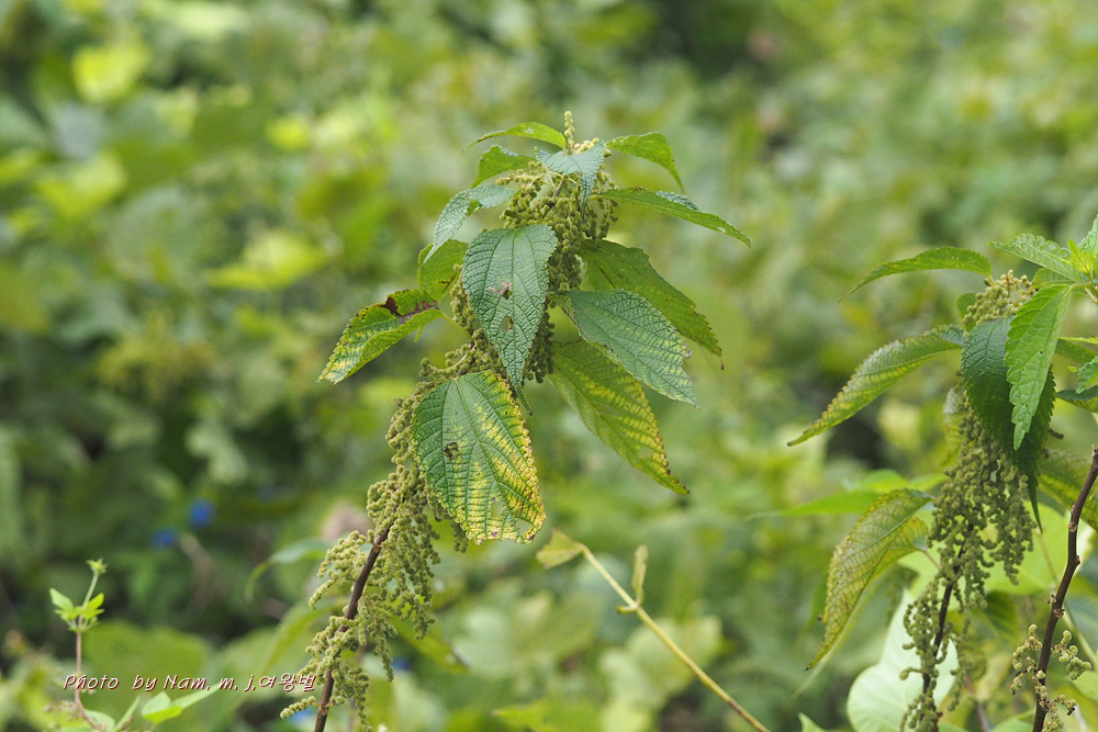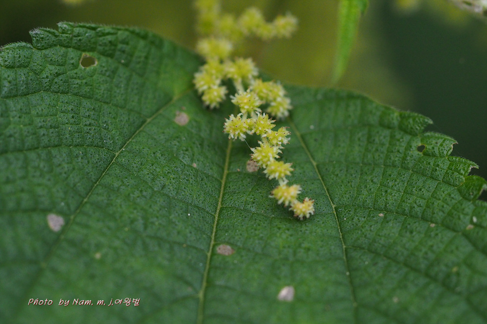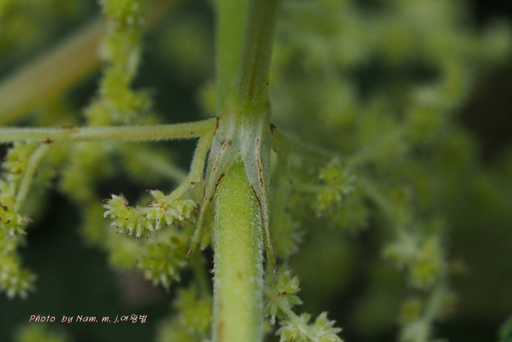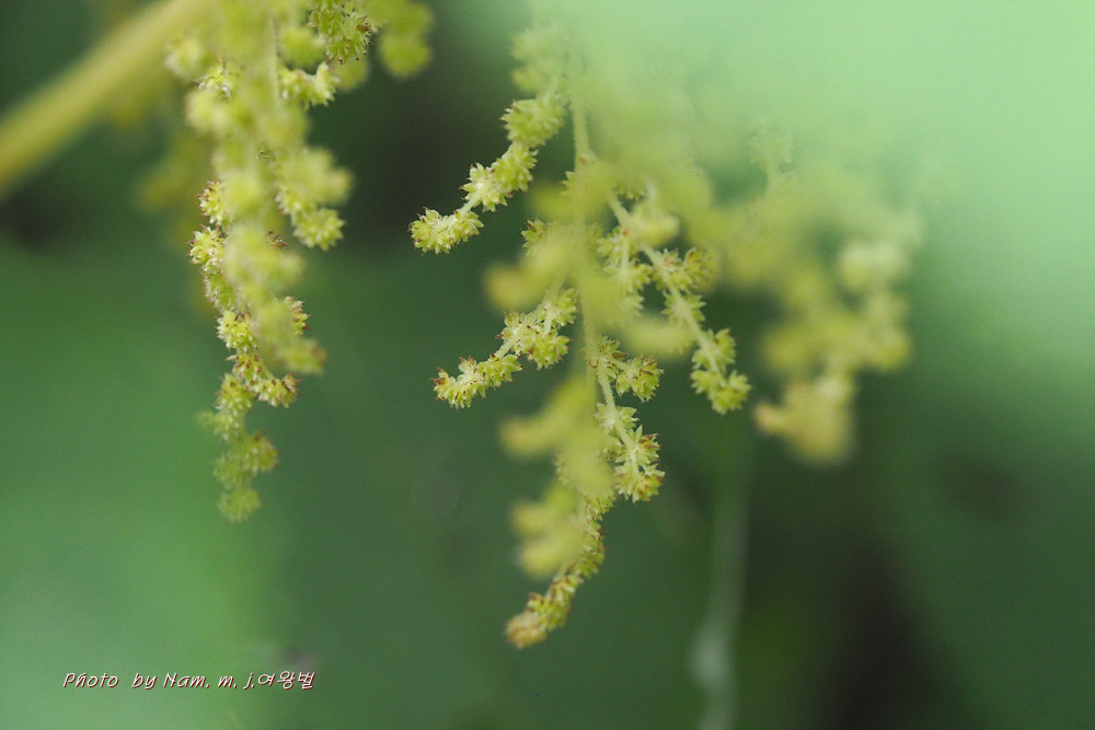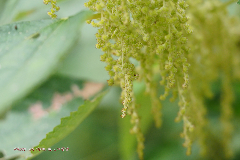 꽃은 자웅일가로 8~9월에 피며 잎겨드랑이에 나는 원뿔모양꽃차례로 달리고 밑부분에 수꽃화서, 윗부분에 암꽃화서가 난다.