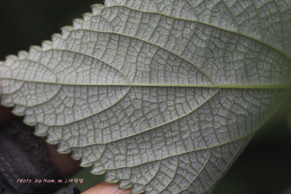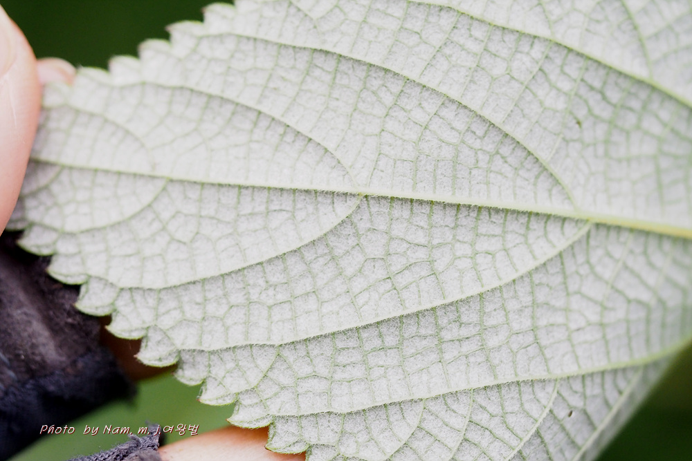 뒷면에는 백색 솜털이 있어 희며 맥 위에 잔털이 있고 잎자루는 3~9cm이며 밑부분에 선상 탁엽이 있다.