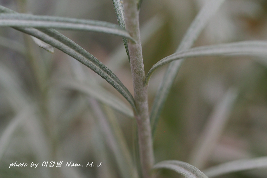 | 잎은 어긋나기하고 밀생하며 중부 및 상부의 잎은 선상 피침형, 피침형 또는 좁은 장 타원형으로 길이 6~9cm, 나비 1~1.5cm이고 끝은 뾰족하거나 둔하며 밑은 좁아져 줄기를 반쯤 싸고 표면은 처음에는 솜털이 있고 녹색이며 뒷면에는 회백색 또는 연한 갈색의 긴 솜털이 밀생한다. |