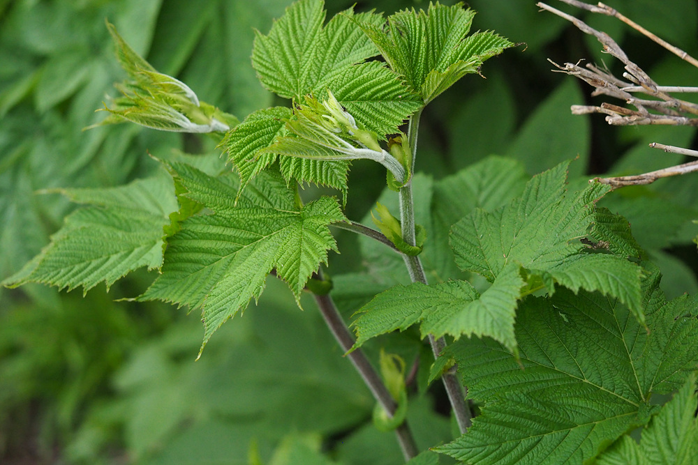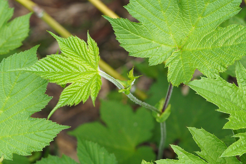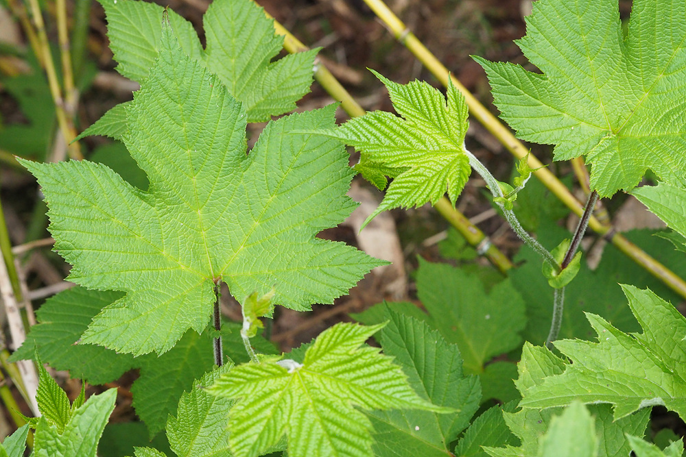 큰 광란형으로 밑은 심장형이고 흔히 장상으로 5열하며 열편은 삼각형 또는 난상 삼각형으로 결각상 겹거치가 있고 잎맥 위에 섞인 털이 있다.