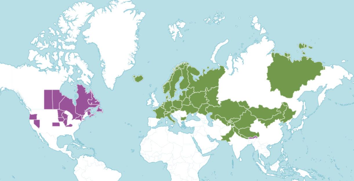 지도에 표기된 분포지를 보면 원산지는 북유럽과 중부 유럽에서 몽골과 히말라야까지로 중국 만주도 포합되어 있는데.....