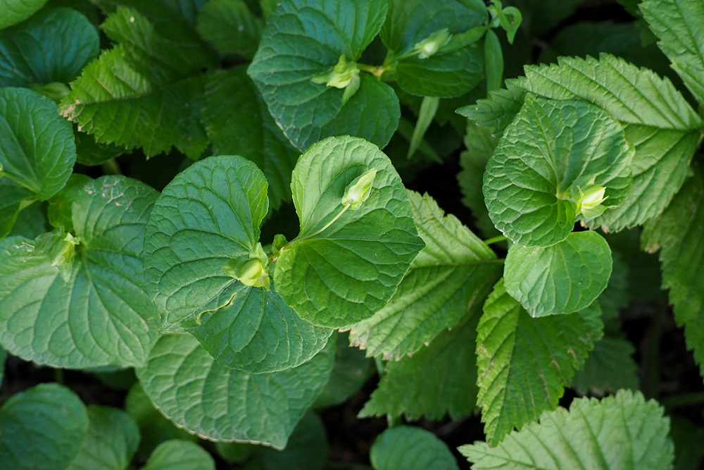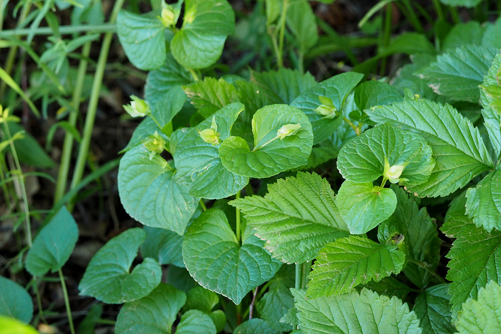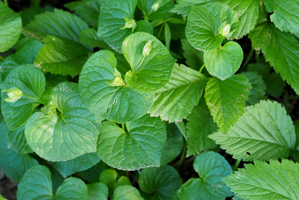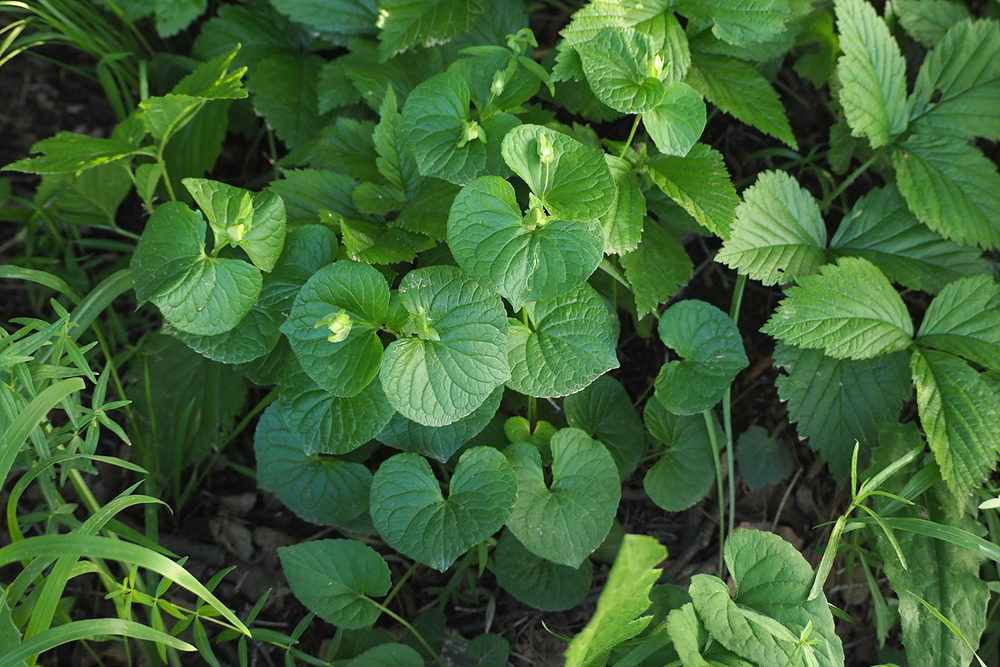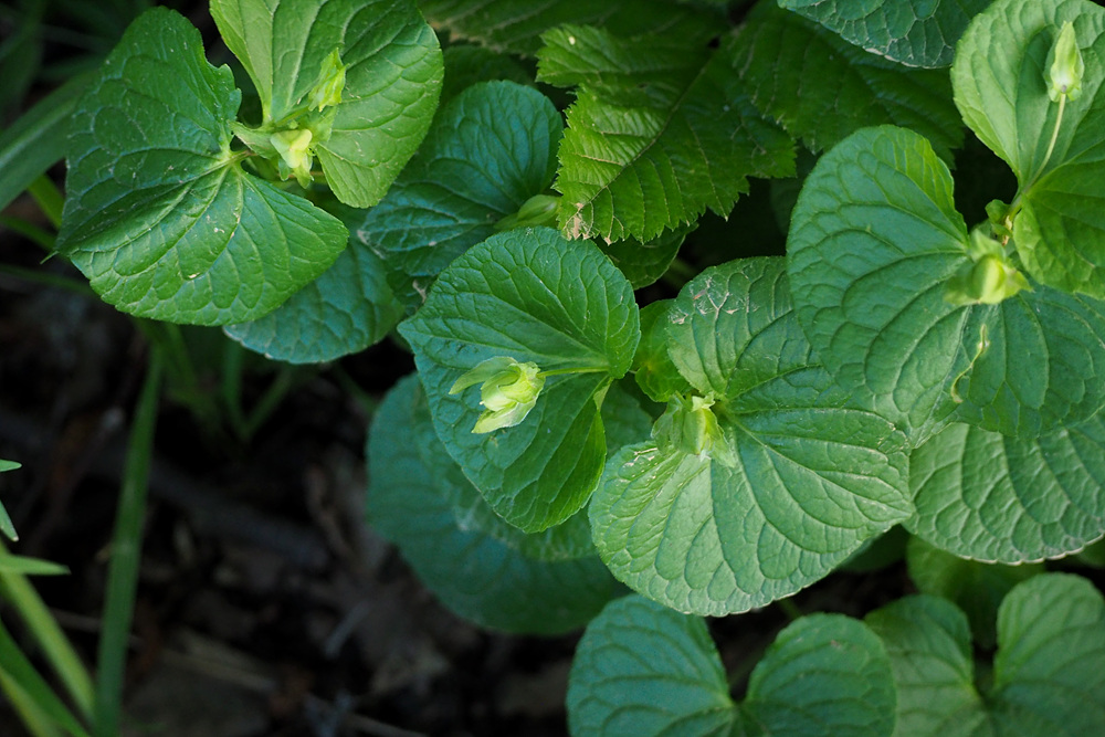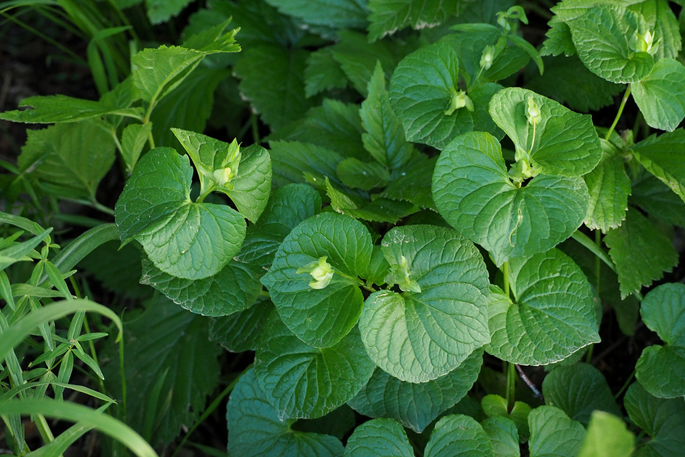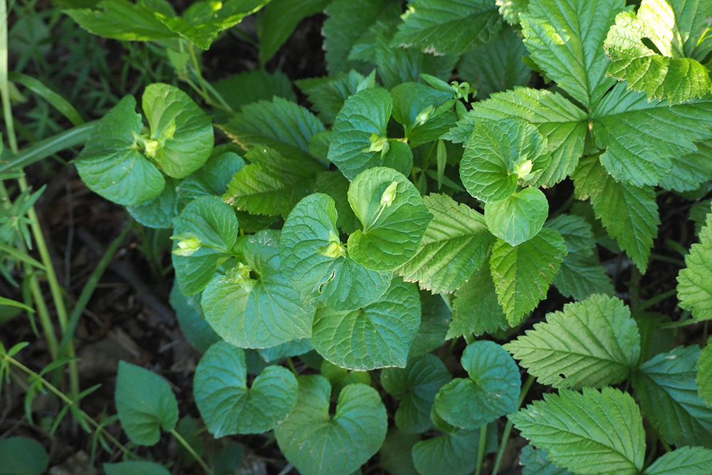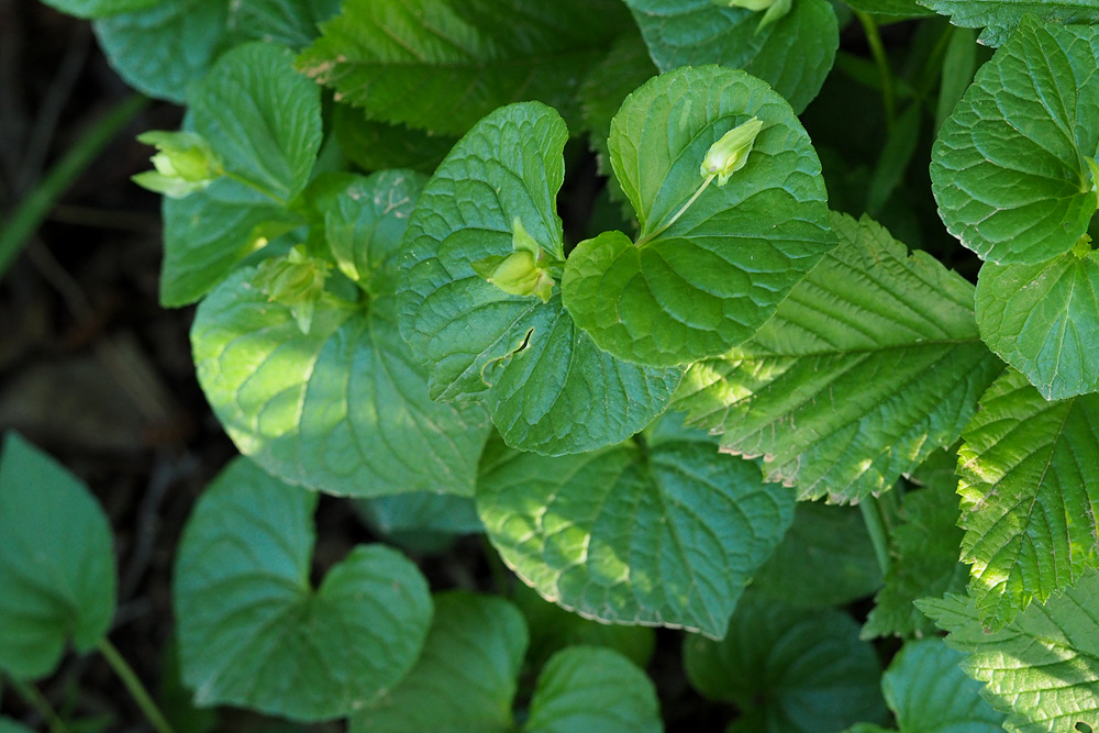 숲 가장자리 나무 아래서 잎 넓은 제비꽃 한 무리를 만났다.