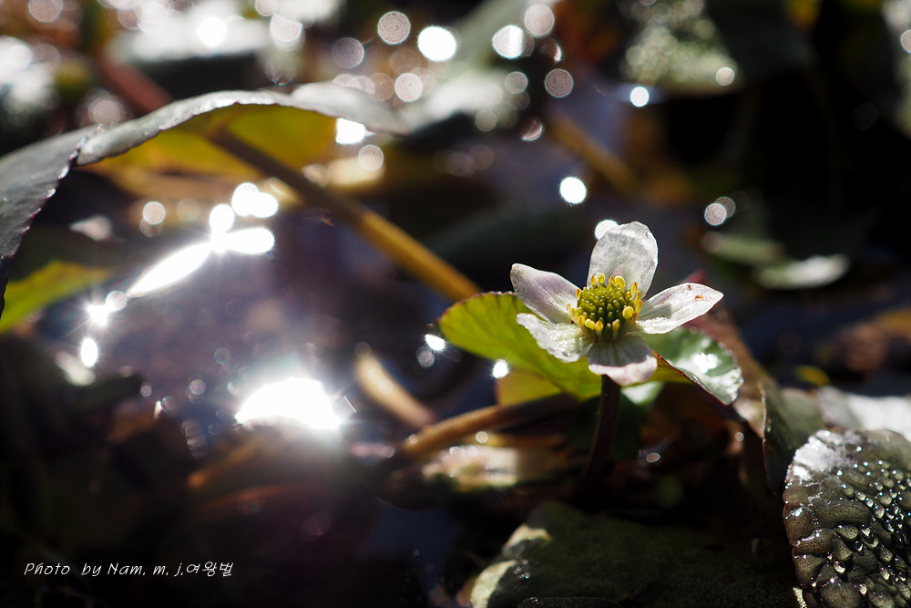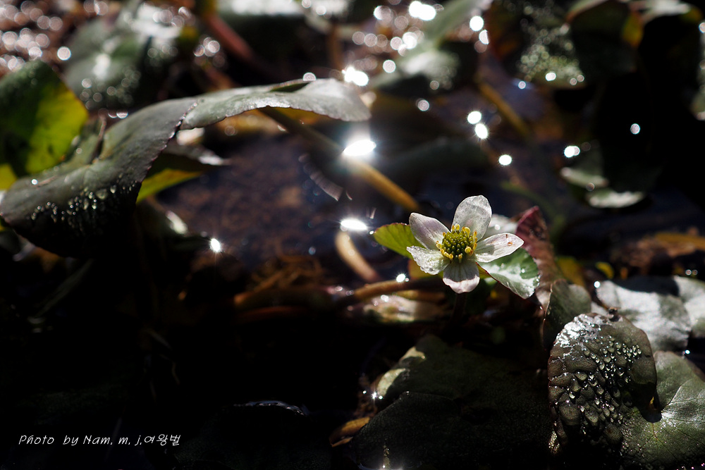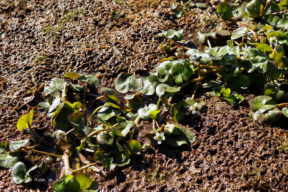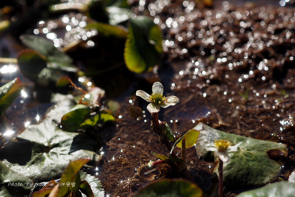 호수변에 물이 고인 습지같은 곳에 애기동의나물과 매화마름류가 진창에서 꽃을 피우고 있다.