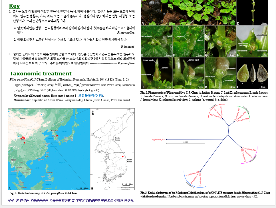 | 한국산 물통이속(Pilea)에 대한 연구를 진행하던 중, 현재까지 기록되지 않은 분류군을 강원도 태백시 금대봉 일대에서 발견하여 미기록종으로 발표하고자 한다. 미기록종인 P. pauciflora는 중국 간쑤성과 쓰촨성의 해발 2,000m 이상의 습한 지역에만 분포한다고 알려진 희귀식물로서 암꽃 화피편 3장 중 1장은 고깔 모양으로 길게 신장되어 수과의 한쪽 면을 감싸면서 뾰족하게 솟아 있으며, 1쌍의 측화피편은 다른 1장에 비해 극히 짧은 특징으로 근연종들과 뚜렷하게 구별된다. 또한 분자유전학적 연구에서도 근연종인 모시물통이, 큰물통이, 물통이와는 명확하게 다른 종임을 보여주었다. 국명은 암꽃 화피편이 수과를 감싼 형태가 고깔모자를 쓴 모습과 유사하여 “고깔물통이”로 신칭하였다. |
