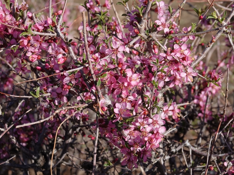 | 최대 2 미터 높이의 관목. 나뭇 가지의 끝은 분기됩니다. 짧은 가지와 잎은 대부분 밀집되어 있고, 긴 가지와 잎은 번갈아 나며, 잎은 대체로 타원형이고 정점은 둔하며 밑면은 쐐기 모양입니다. 꽃은 짧은 가지에 고독합니다. 꽃받침은 장방형이며 꽃받침관과 거의 같으며 꽃잎은 도란형이며 분홍색입니다. 핵과는 넓게 난형이고, 정점은 뾰족하며, 바깥쪽은 빽빽하게 털이 있습니다. 살은 얇고, 익었을 때 갈라지며, 구덩이에서 분리되어 있습니다. 핵은 타원형이며 비대칭이며 기부의 양쪽이 매끄럽습니다. 커널은 대체로 난형이며 밝은 황갈색입니다. |