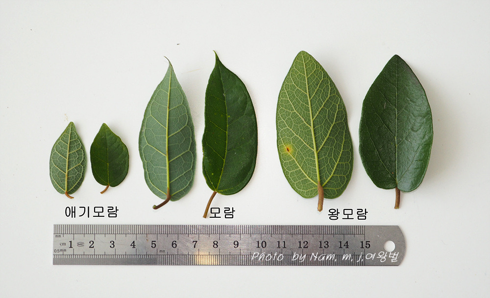 엽형은 애기모람과 유사하지만 묵은 가지 잎의 크기는 모람보다 더 넓다.