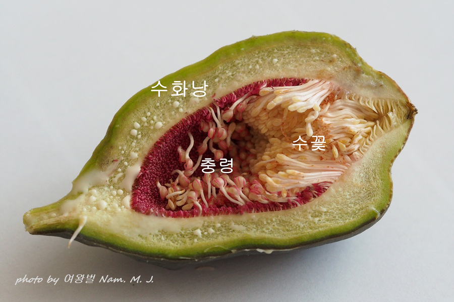 화낭 입구 주변에 수꽃과 안쪽에 좀벌이 산란하는 충영꽃으로 이루어져 있다.