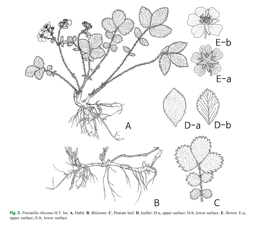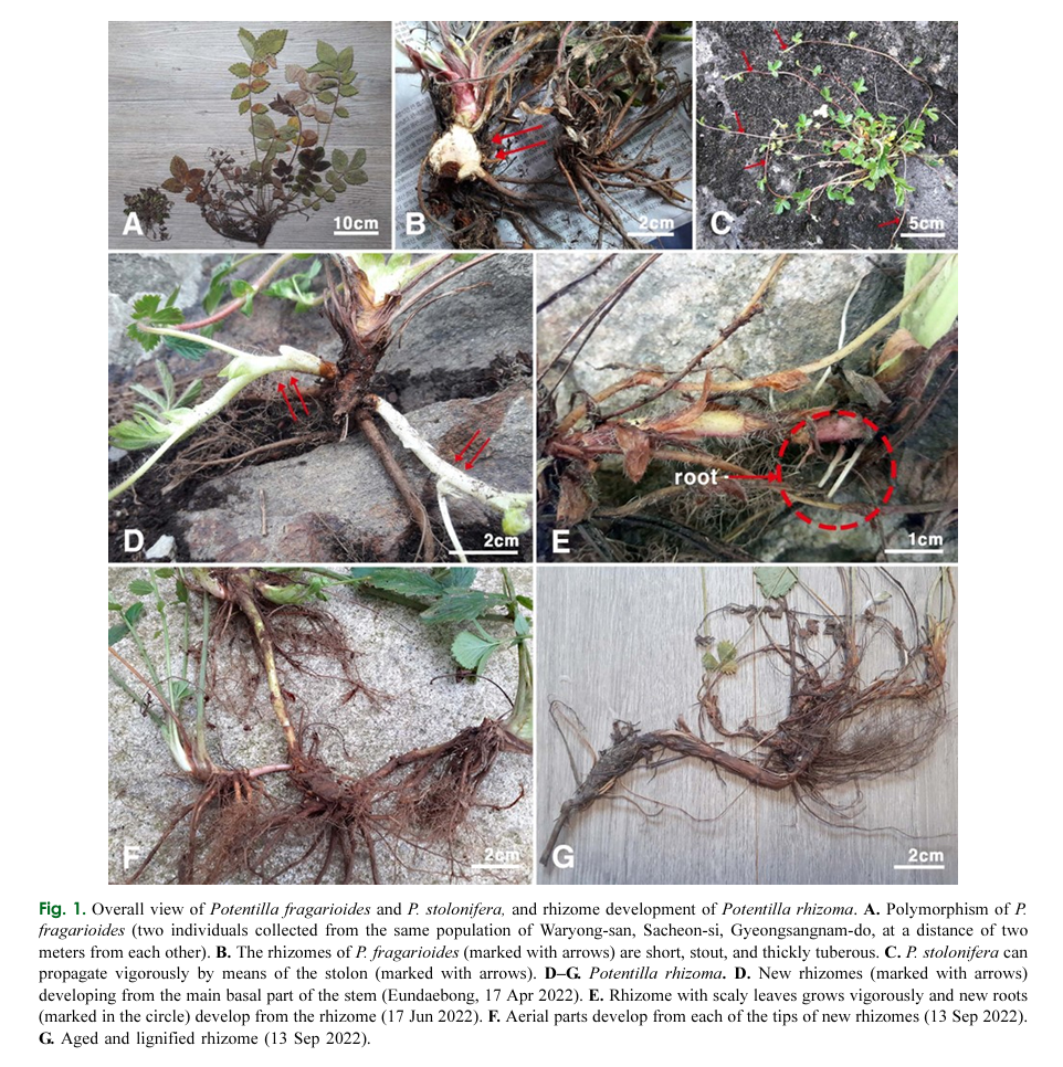 B. P. fragarioides의 근경(화살표로 표시)은 짧고 튼튼하며 굵은 괴경이다.