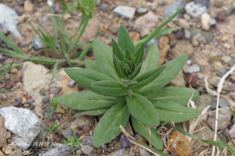 잎은 어긋나며, 줄기 아래쪽 잎은 피침형으로 양면에 털이 빽빽하게 난다.