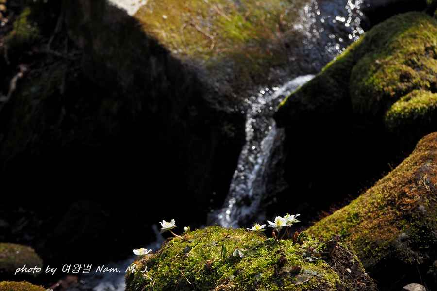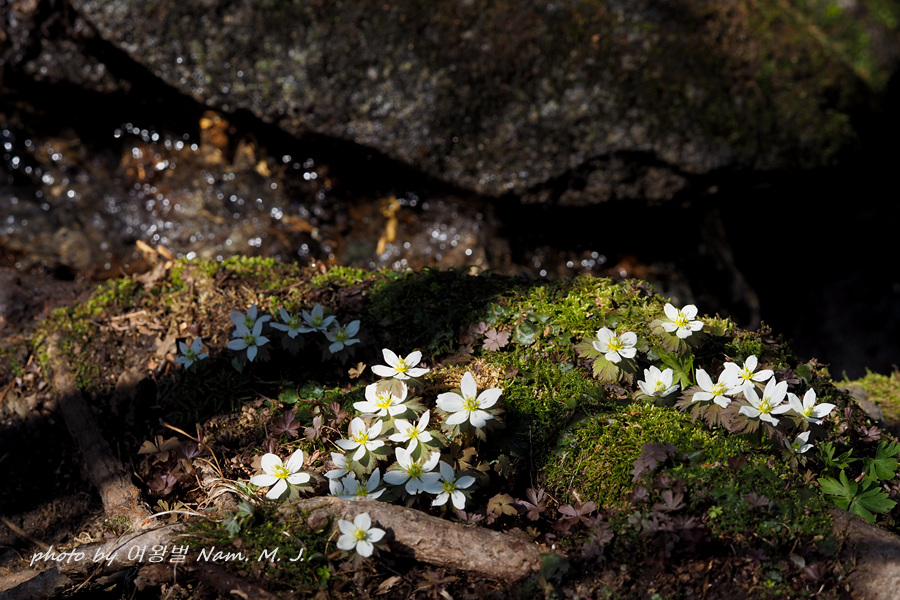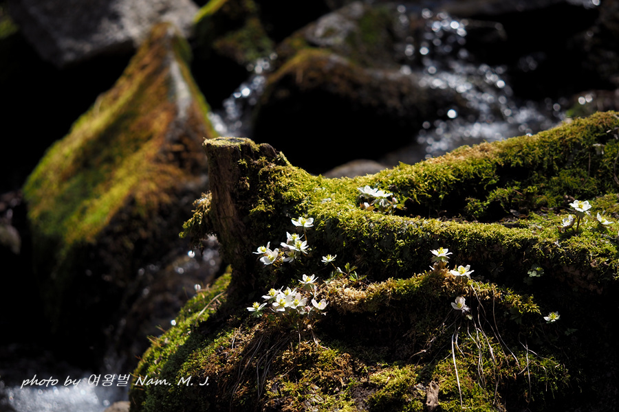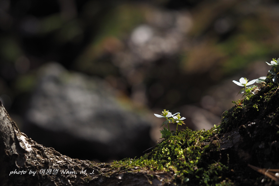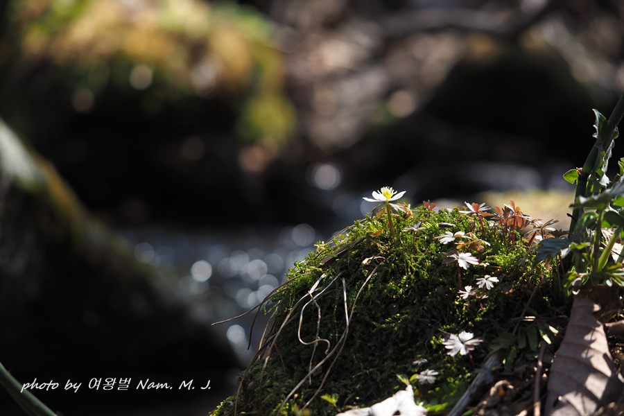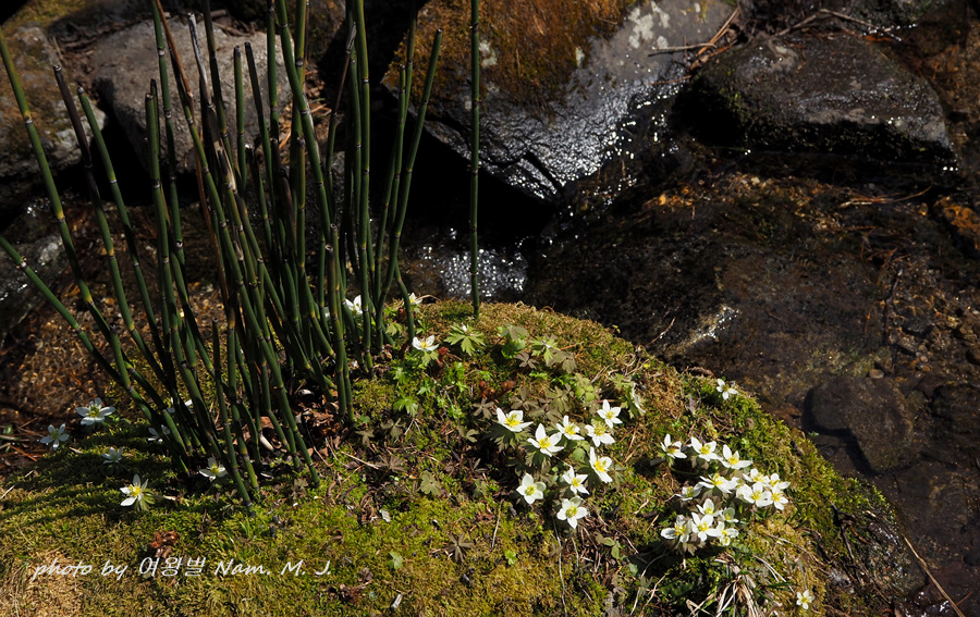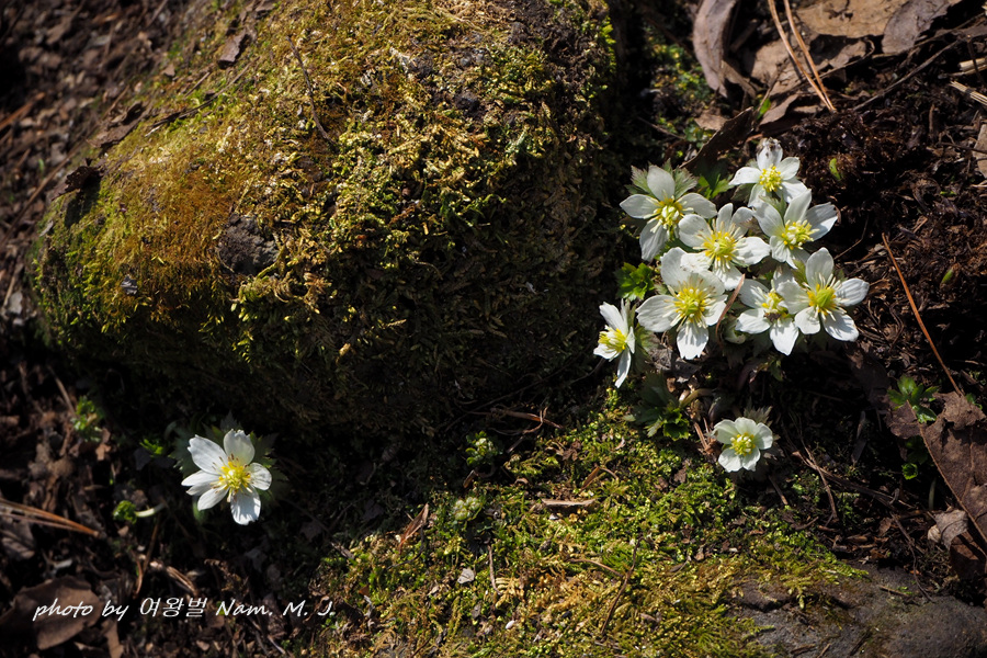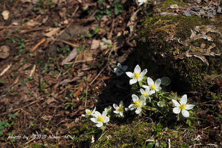아직 잎도 나지 않은 갓 피어닌 어린 꽃들이 이끼바위 위에 앉아서 온갖 표정을 다 짓고 있다.
