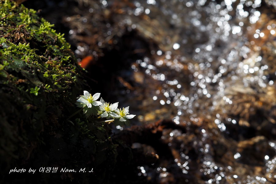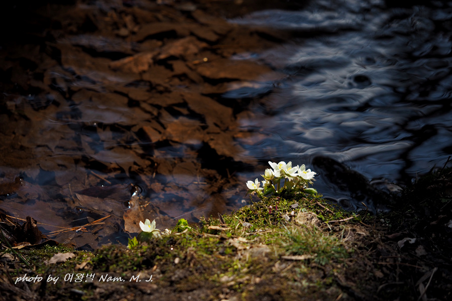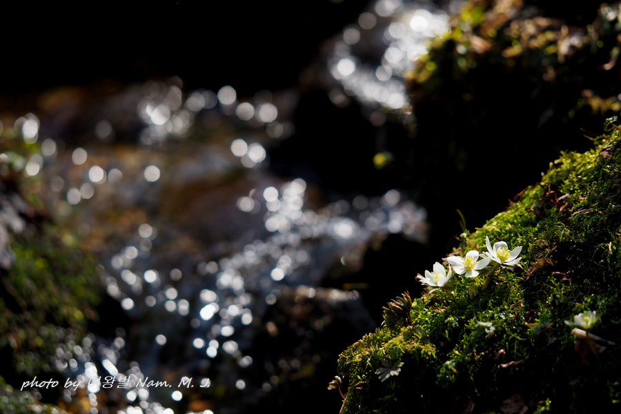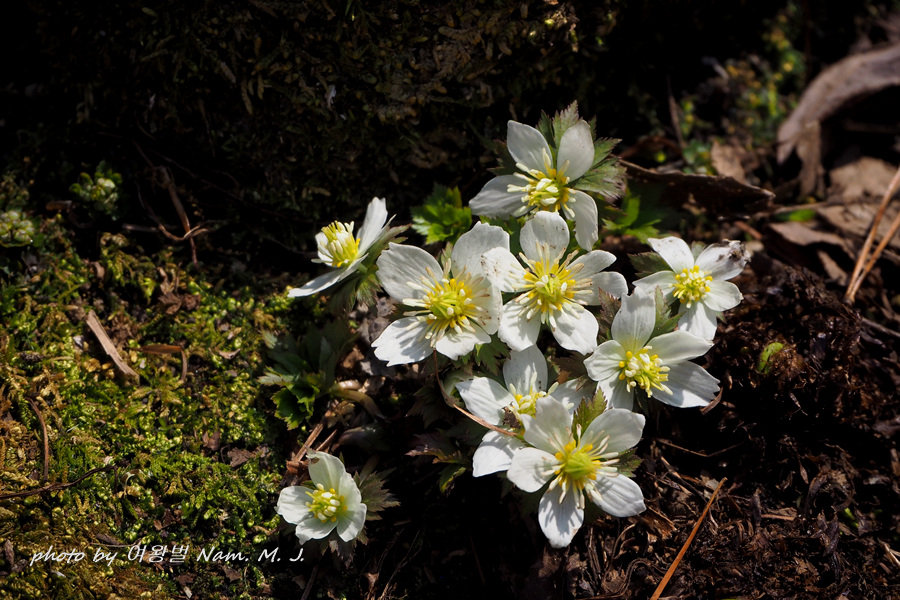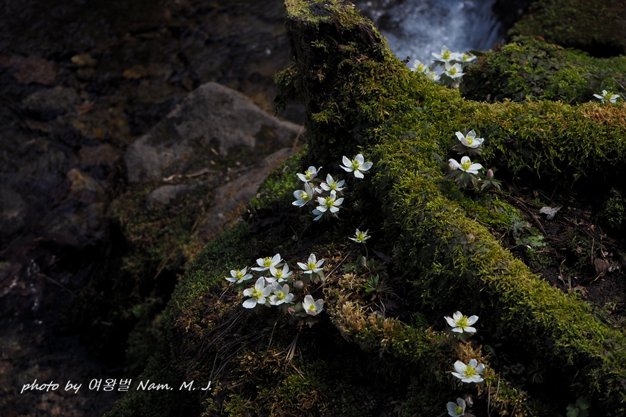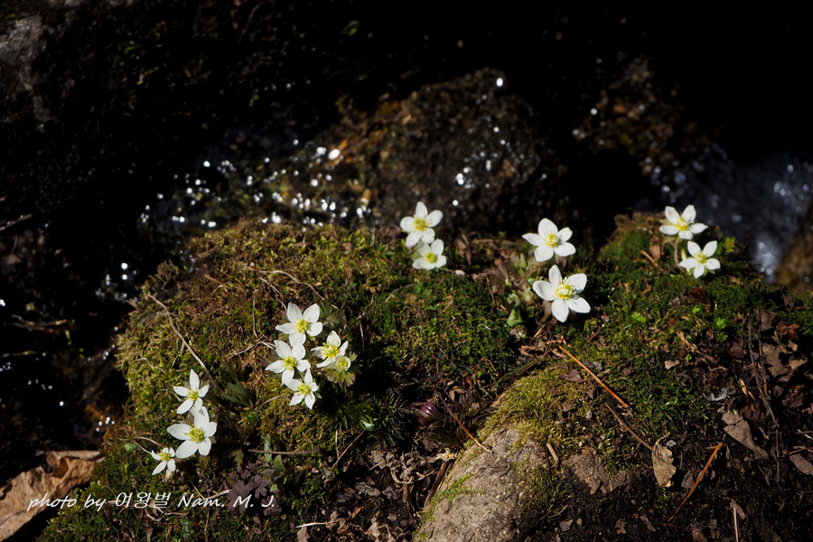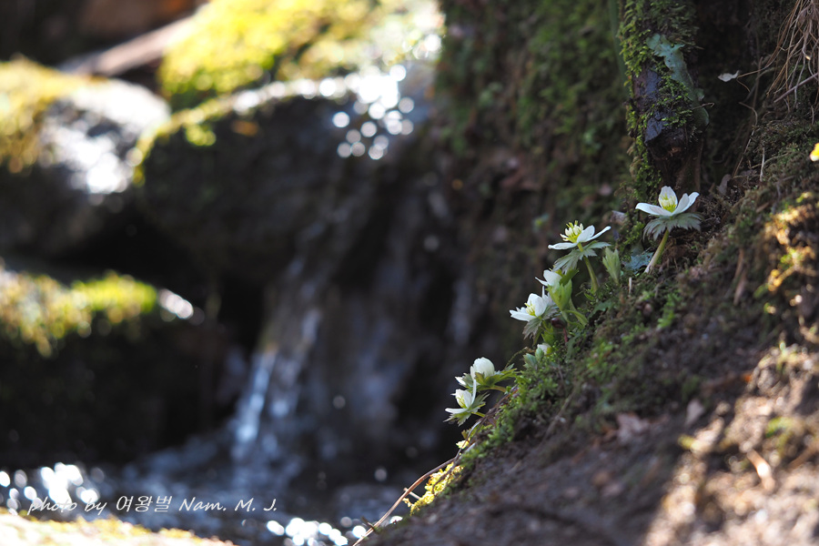 아직 잎도 나지 않은 갓 피어닌 어린 꽃들이 이끼바위 위에 앉아서 온갖 표정을 다 짓고 있다.
