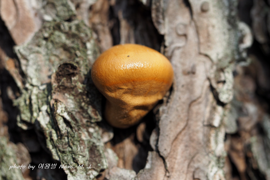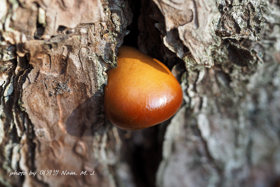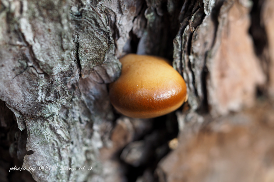 그 틈새를 비집고 갓 구워낸 미니 빵 같은 버섯이 죽은 소나무 등걸에서 자라고 있다.