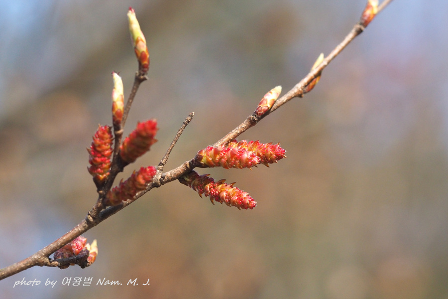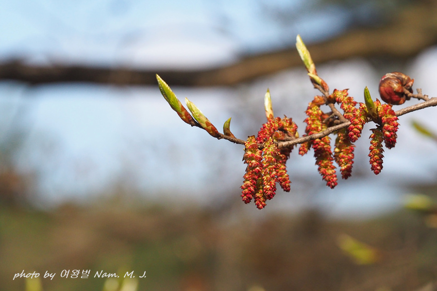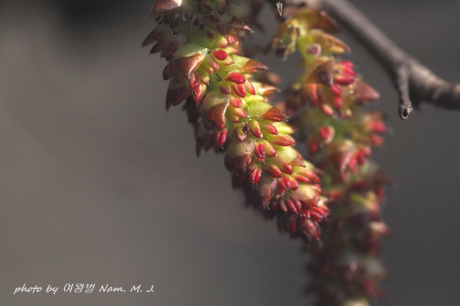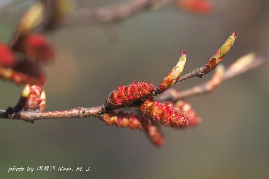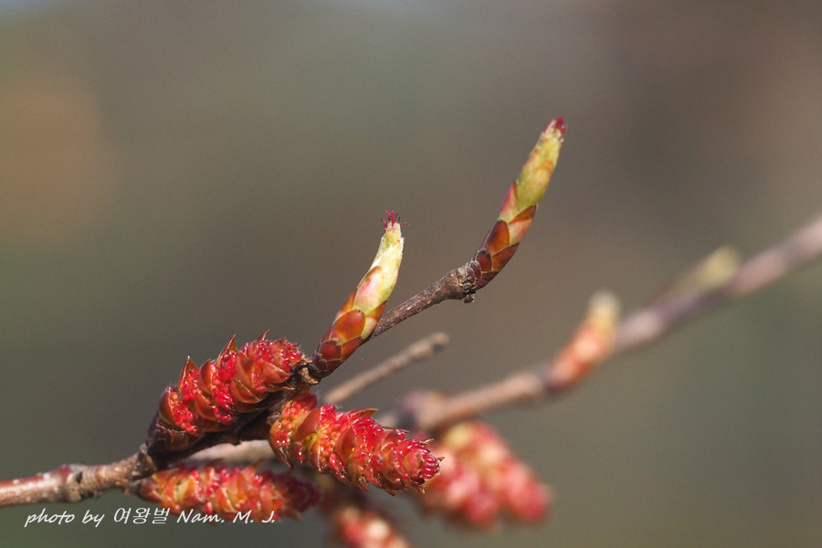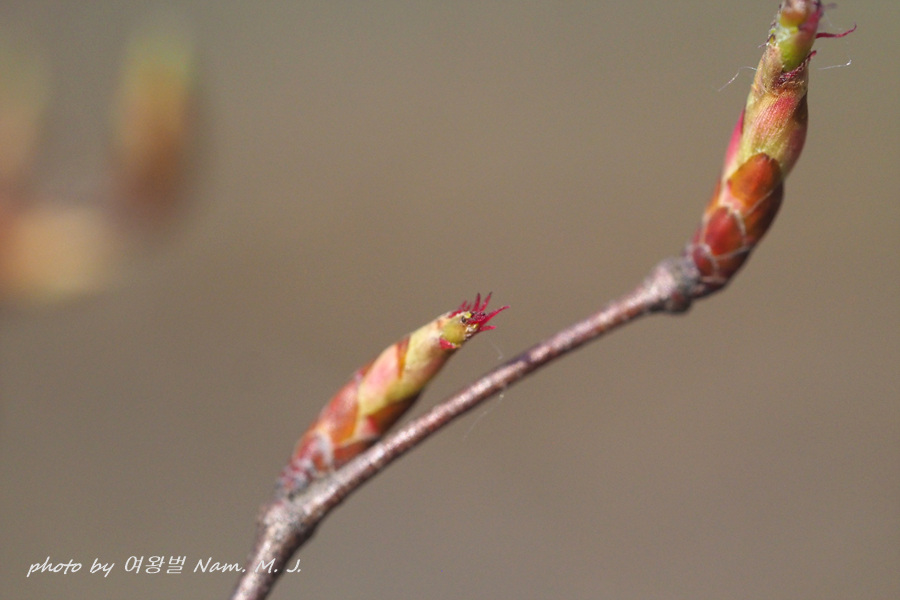 가지 끝에 달린 암꽃눈이 터지고 있다.