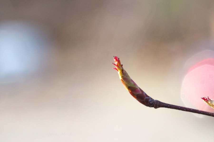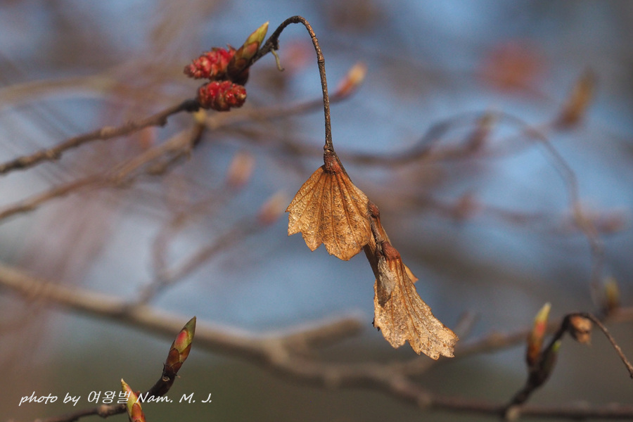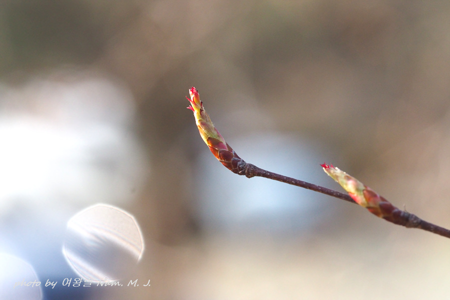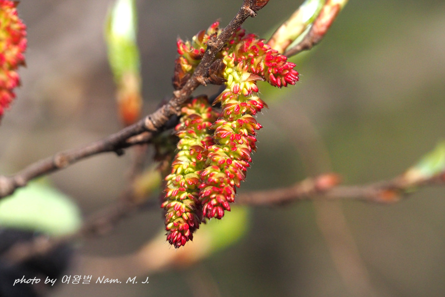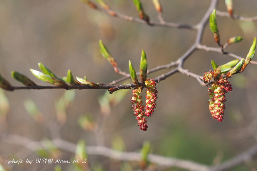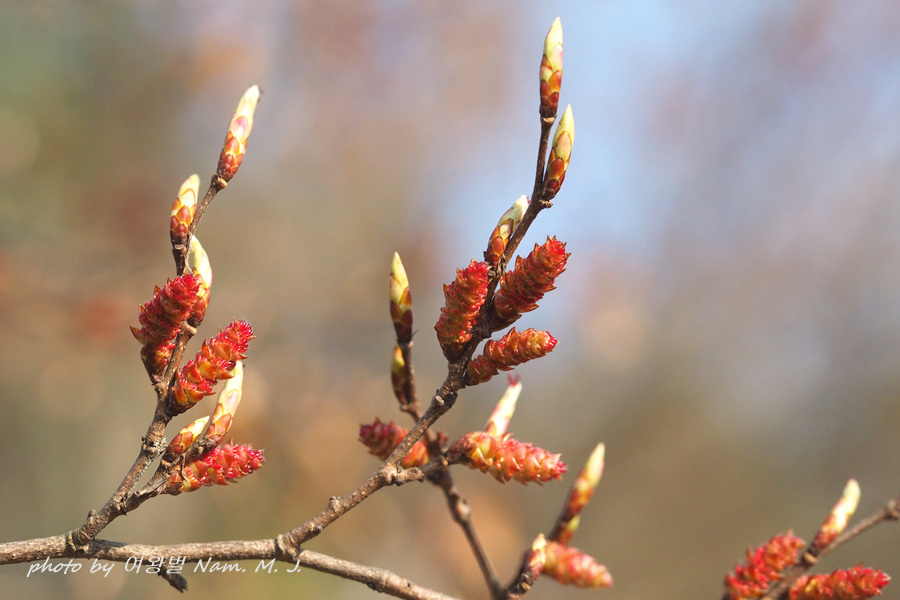 가지 끝에 달린 암꽃눈이 터지고 있다.