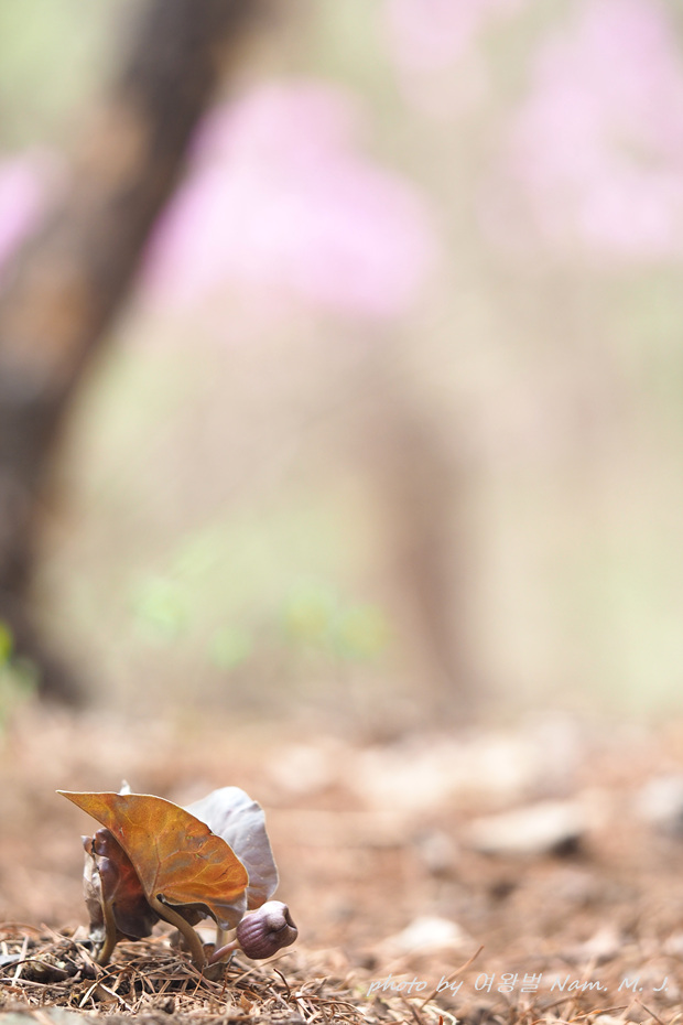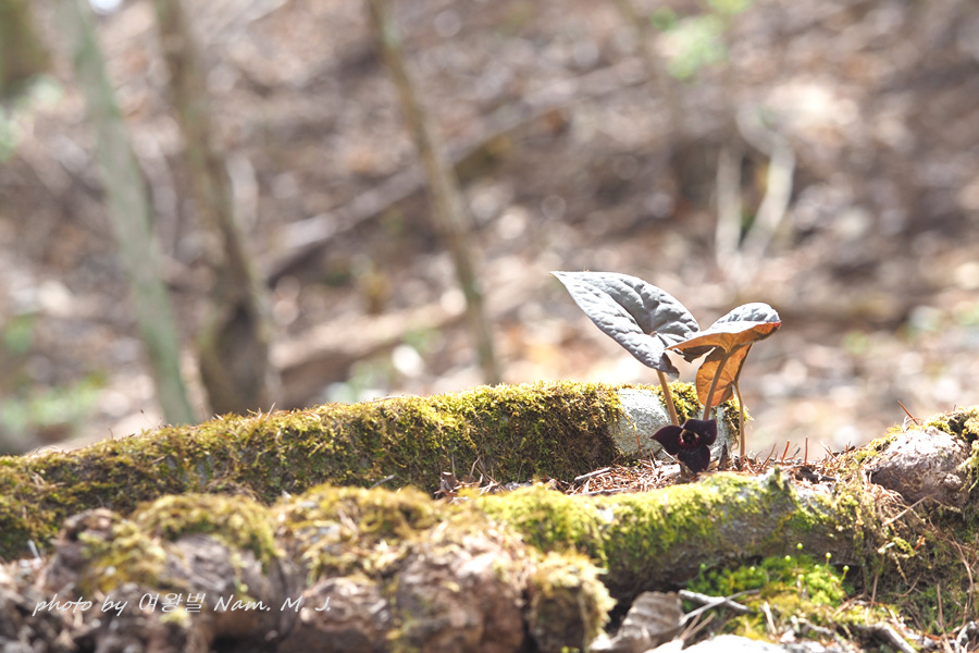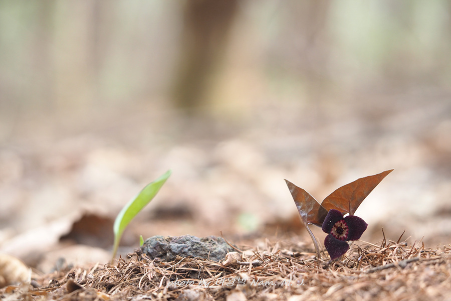 산 계곡 낙엽송 아래 자주족도리풀이 깜찍하게 피어 있어서 귀엽다를 연발하였다.