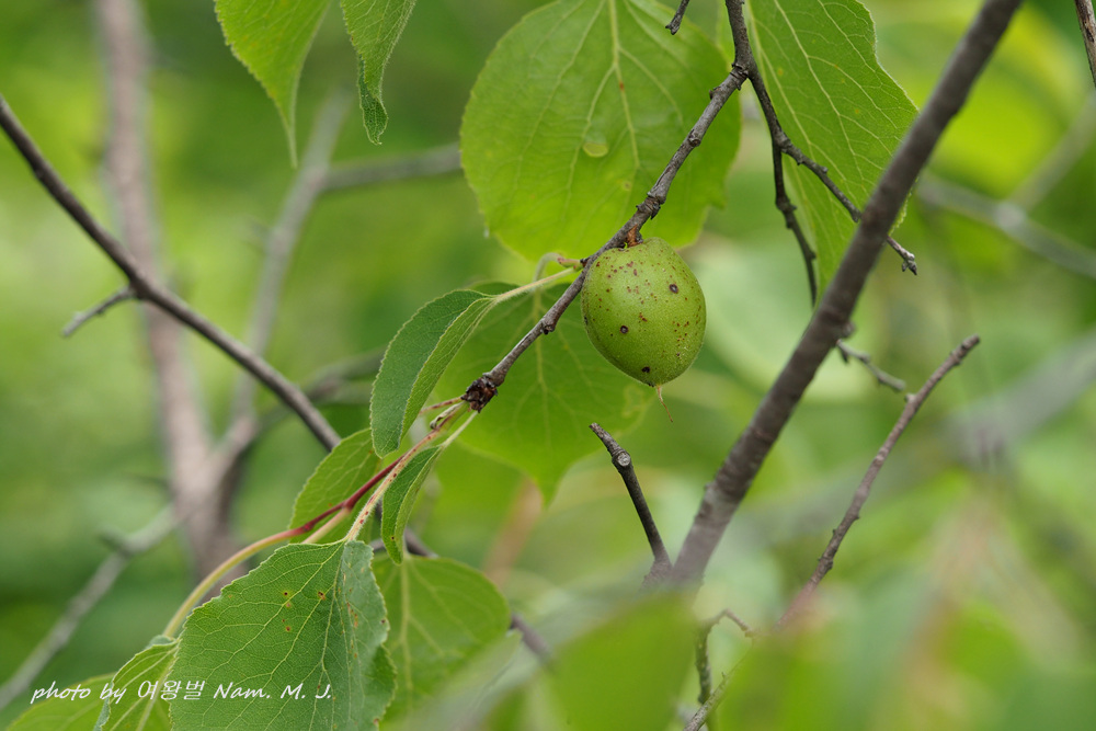 열매는 살구보다 작고 양쪽이 납작한 편구형이다.