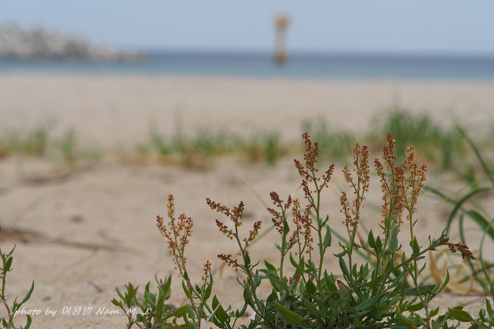 빨간 등대를 바라보며 모래사장에 옹기종기 모인 애기수영이 귀엽다.
