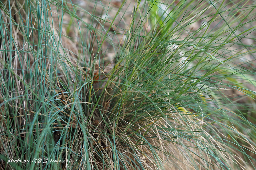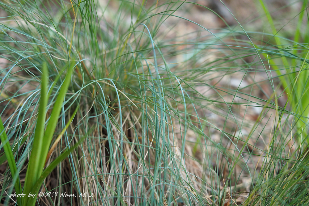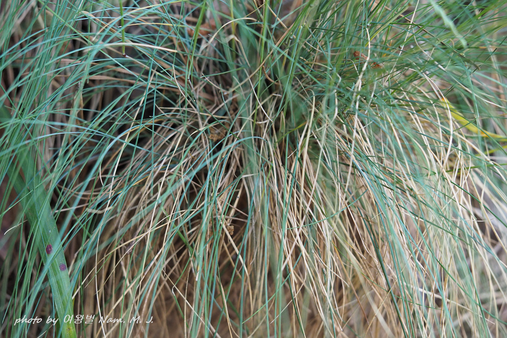 황톳길 맨발 걷기하는 산책로를 따라 김의털이 회청색 분위기를 내면서 실처럼 가느다란 잎을 뭉쳐서 보여준다.