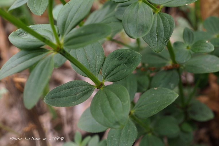 | 허브, 다년생, 얇은 기는 뿌리 줄기에서. 줄기는 직립하고 높이는 20-35cm이며 4 개의 두꺼운 능각도이 있으며 마디는 매끄럽고 광택이 있거나 흉측합니다. 잎은 4 (-6)의 소용돌이, subsessile, 잎자루는 최대 2mm입니다. 잎은 종이 모양에서 가죽 모양, 타원형 또는 타원형 타원형에서 난형으로 건조, (12-) 20-25 (-28) × (7-) 10-11 (-15) mm, 주요 잎맥을 따라 광택이 있거나 털이 많거나 털이 많거나 흉측한 모양, ± 갑자기 짧은 잎자루로 좁아지고 가장자리는 antrorsely ciliolate, 정점은 둔각에서 아 급성; 주요 잎맥 3-5, 손바닥 모양. 꽃차례, umbel-like thyrsoid 및 가장 위쪽 잎 겨드랑이에서 말단 및 측면 cymes가 있는 많은 꽃이 만발한 원추 모양; 꽃자루는 매끄럽고 광택이 있습니다. 포엽은 좁게 타원형 또는 타원형으로 결찰되며 1-3 × 0.5-1.5 mm; 작은 꽃자루 0.5-1.5 mm. 난소 타원체, ca. 0.8mm, 광택이 있습니다. 화관 흰색, 깔때기 모양, 튜브 ± 엽만큼 길고 직경이 4-5mm입니다. 엽 4, 타원형 타원형. 메리카르프는 난형이며 1.7-2.8mm이며 광택이 있고 부드럽습니다. Fl. 및 fr. 7월-9월. 산 경사면에 열린 숲; ca. 1700 m. 헤이룽장성, 길림성, 산시성[한국, 러시아]. |