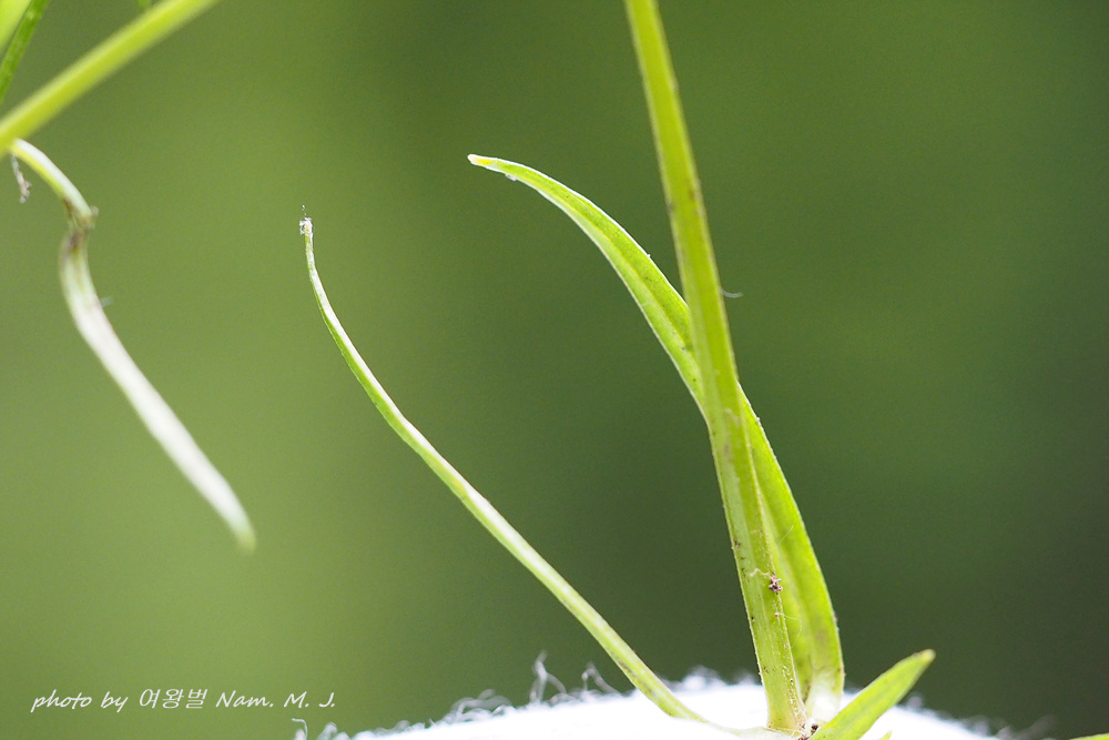 선형, 길이 2~3cm, 폭 1~2mm 앞면에서 가운데 잎맥 다소 들어가고 뒷면에서는 두드러진다 |