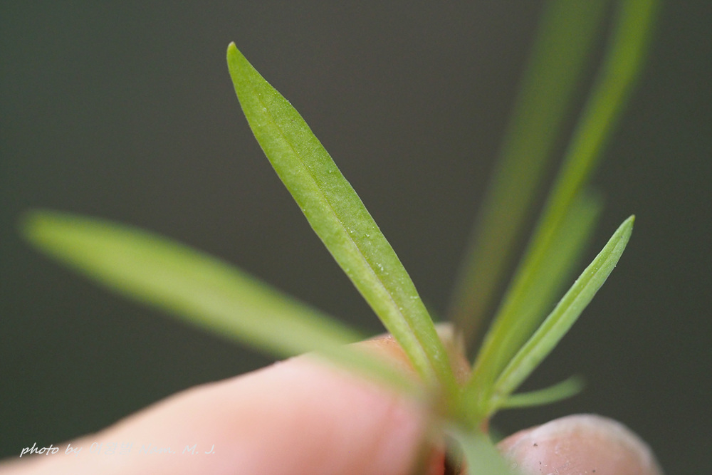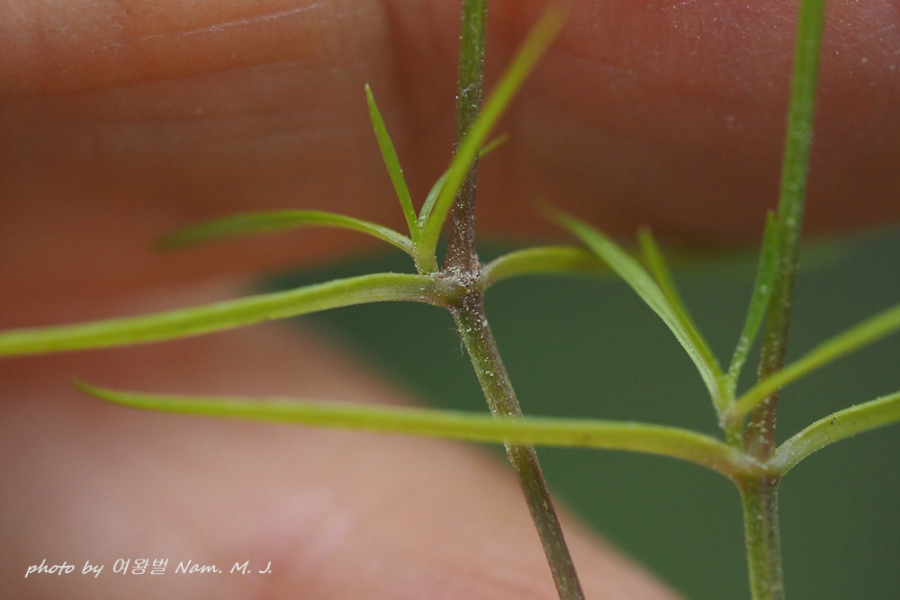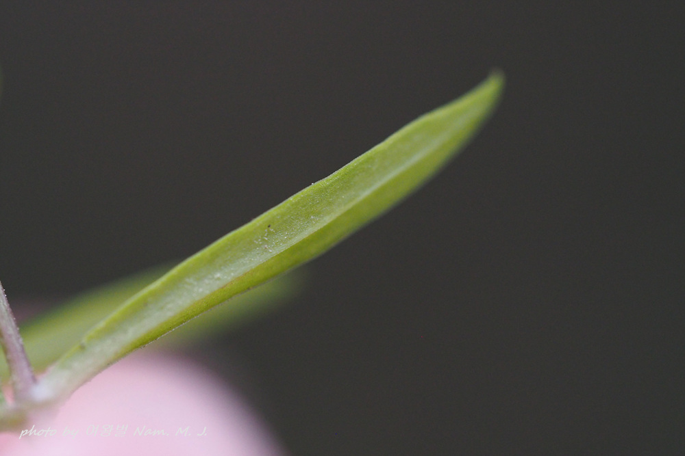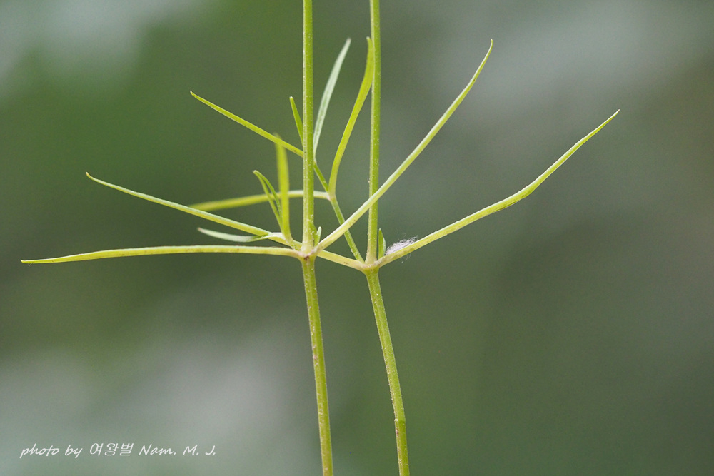 | .원줄기의 능선 위에 미세한 돌기가 있다. 잎은 마주나기하고 엽병이 없으며 선형이고 끝이 뾰족하며 길이 1.5~2.5㎝, 폭 1.5~2.5㎜로서 비스듬히 서고 양면에 털이 없다. 꽃은 7~8월에 피고 잎겨드랑이에서 자라는 꽃자루 끝에 취산꽃차례로서 1개씩 달리며 꽃자루는 길이 2~6㎝로서 꽃이 핀 다음 굽고 밋밋하다. 화피 열편은 달걀 모양이며 털이 없고 희미한 3맥이 있으며 길이 2.5~3㎜로서 꽃잎보다 다소 짧고 꽃잎은 끝이 2개로 갈라진다. |