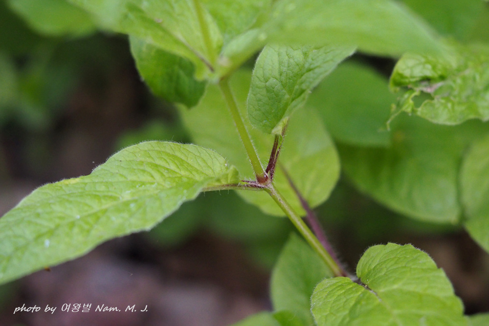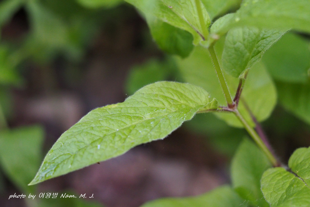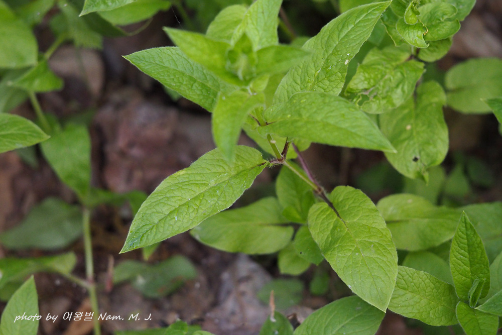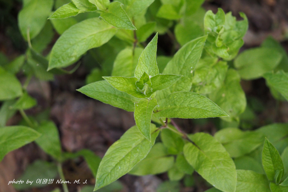 잎은 마주나기하고 난상 장타원형으로 길이 4~8㎝, 너비 2~3㎝이며 끝은 뾰족하고 밑은 둥글며 연모가 있다.