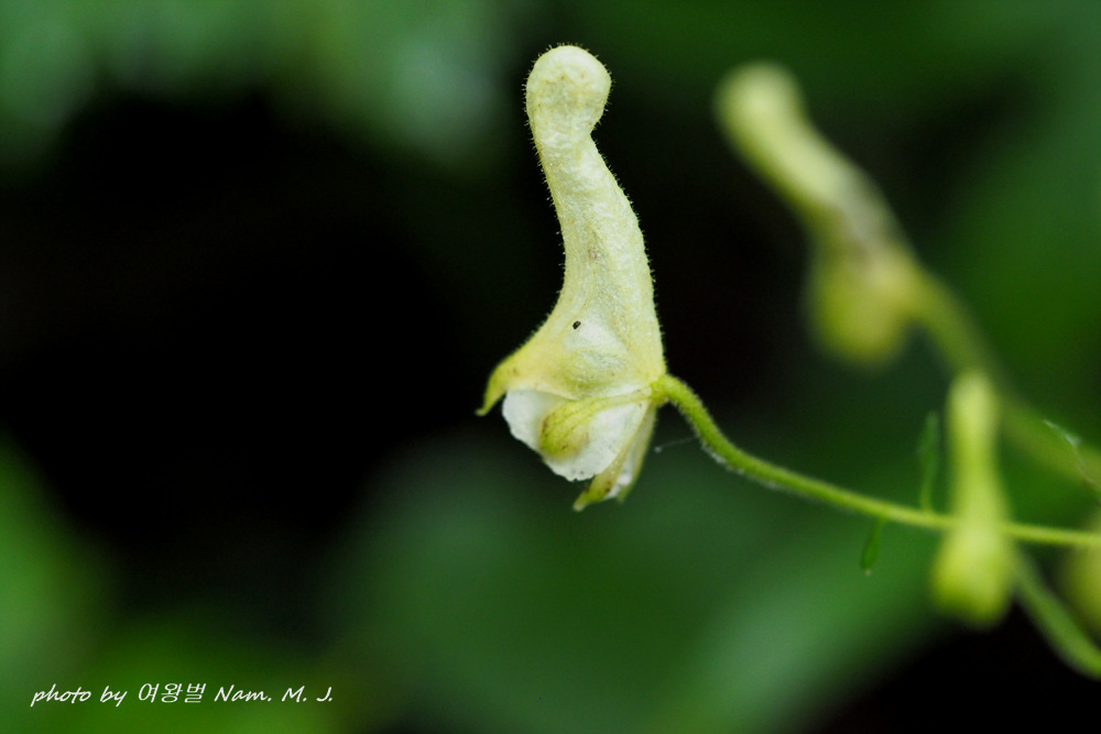 선투구꽃이랑 비슷하지만 더 길쭉하고 꽃자루에 퍼진 털이 있다.